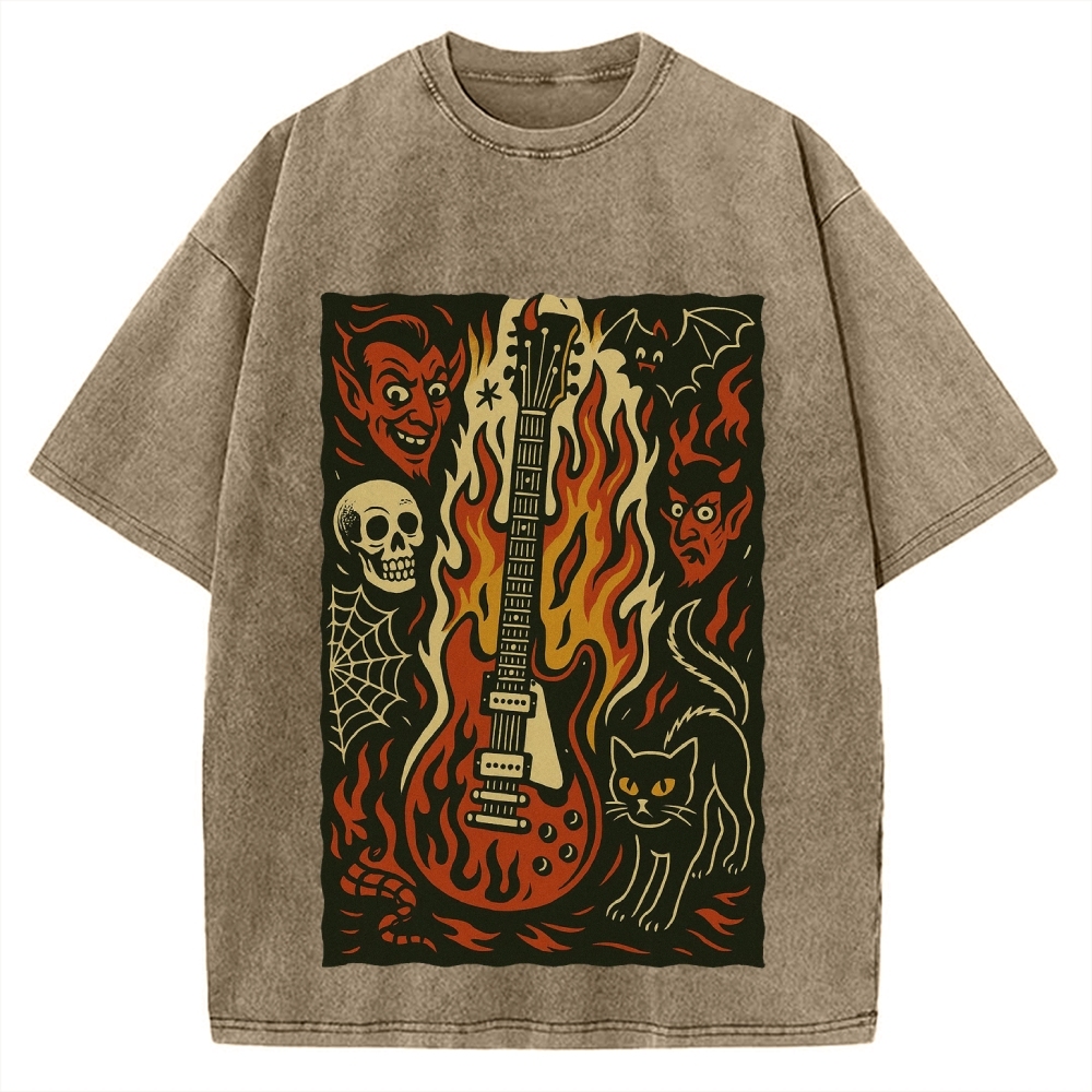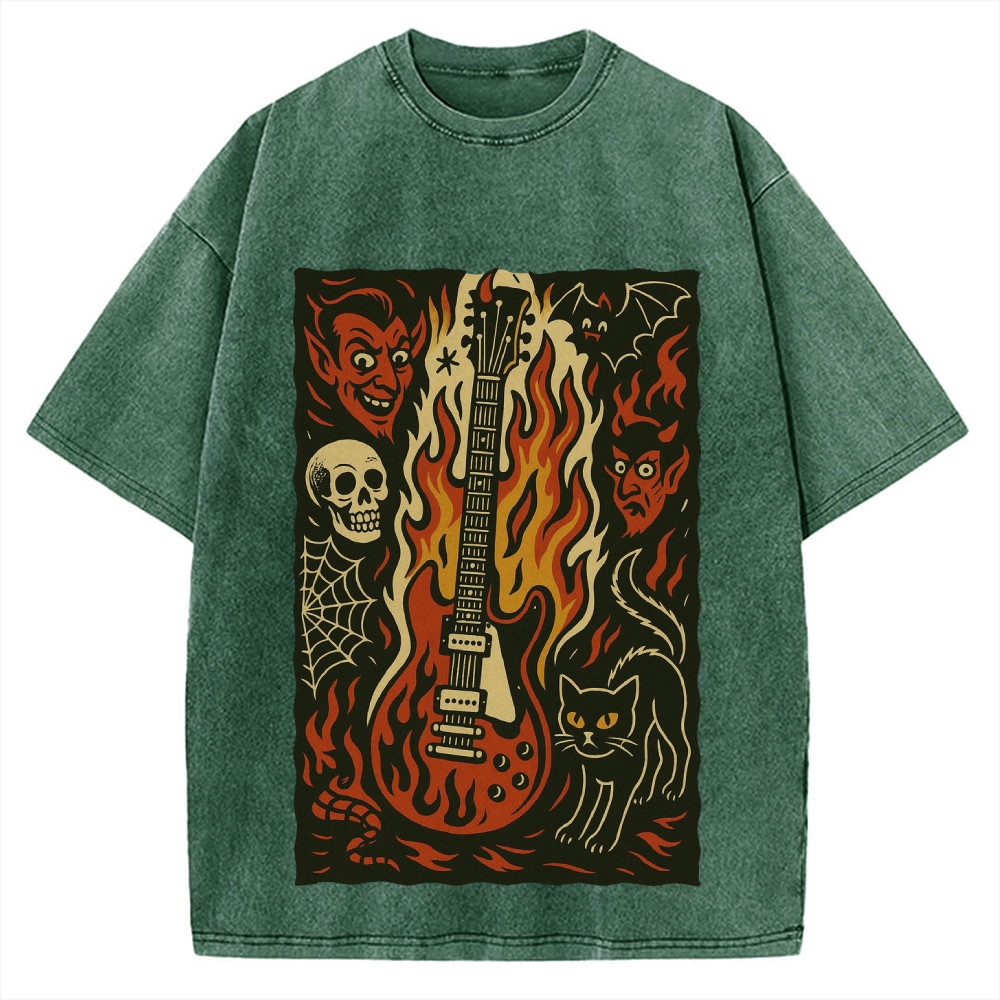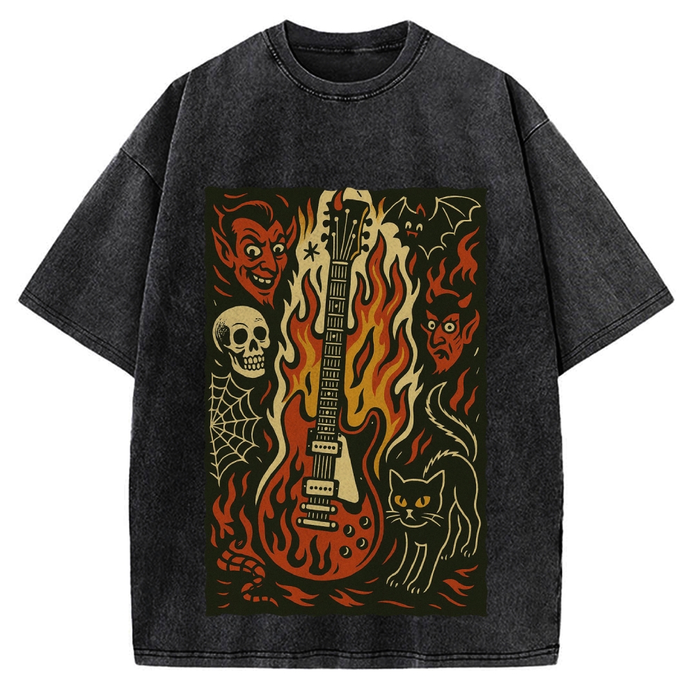 Tokyo-Assassin Jigoku Guitar Demon Skull Cat Vintage Washed T-shirt