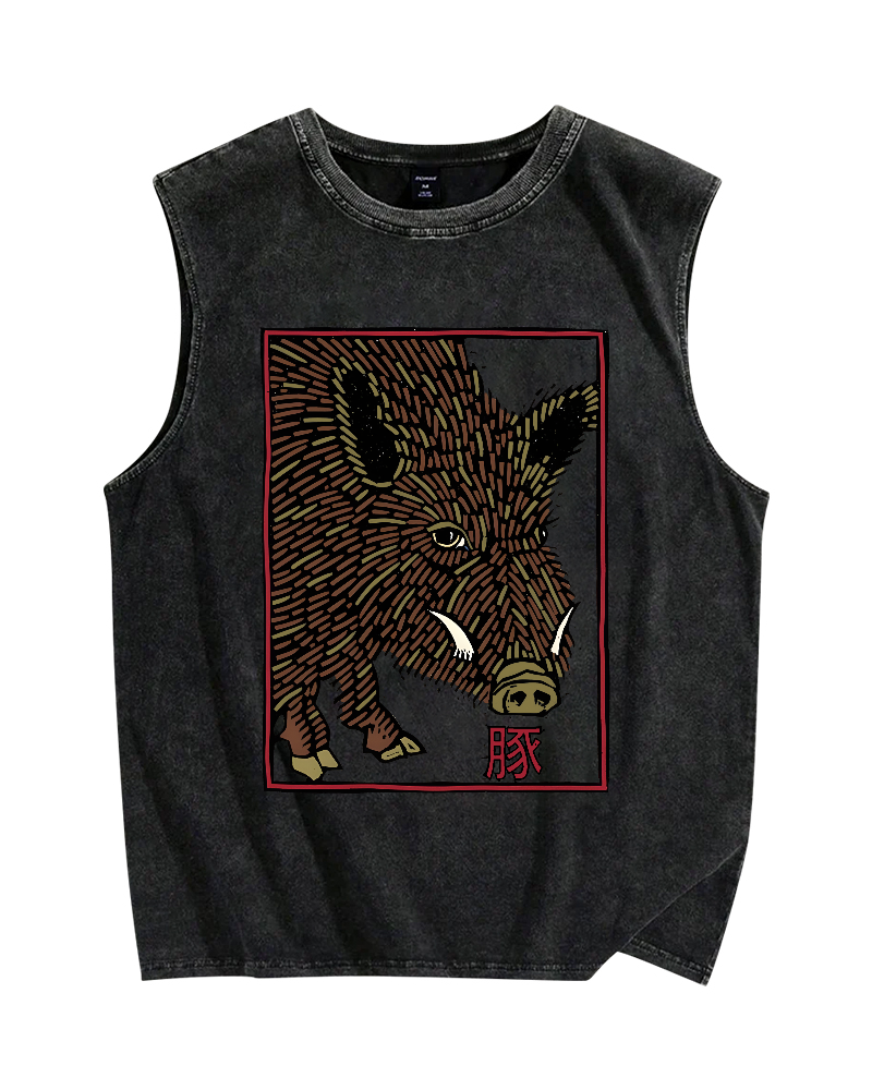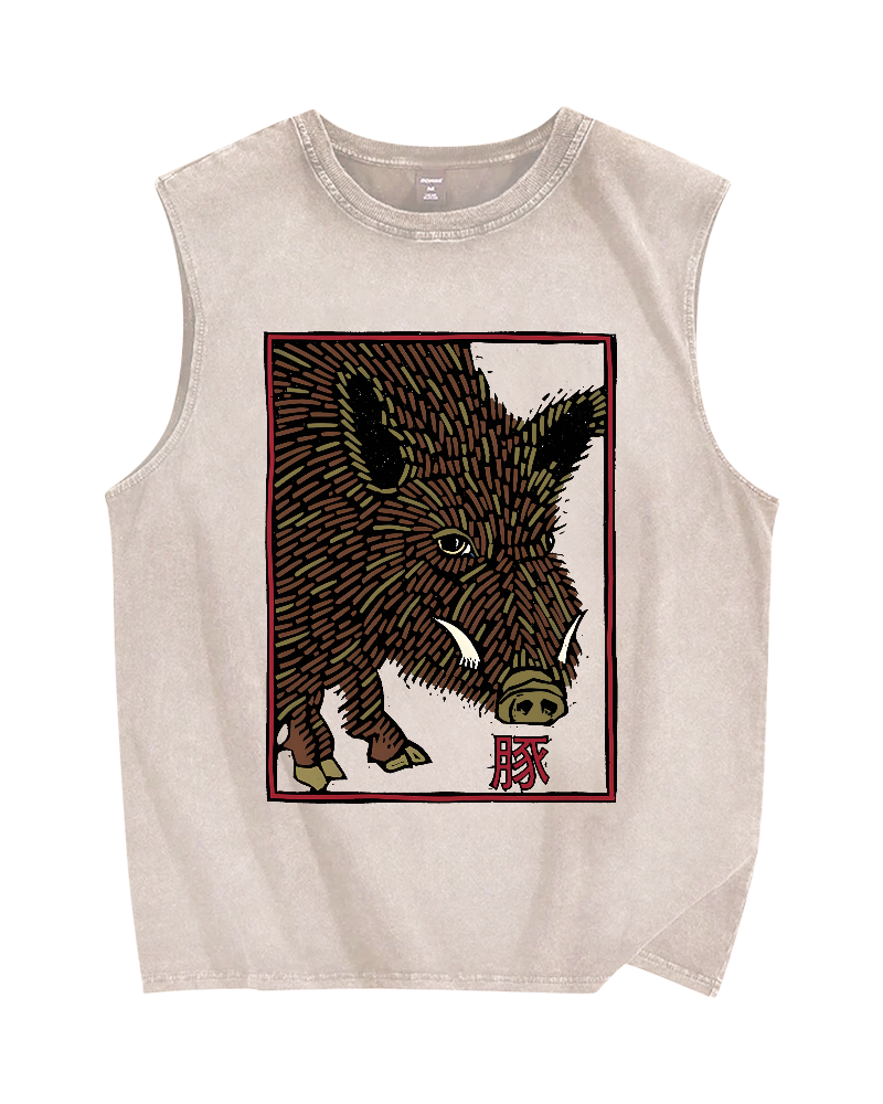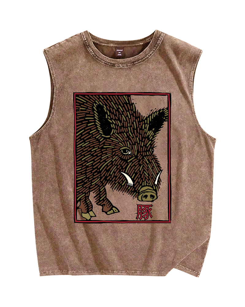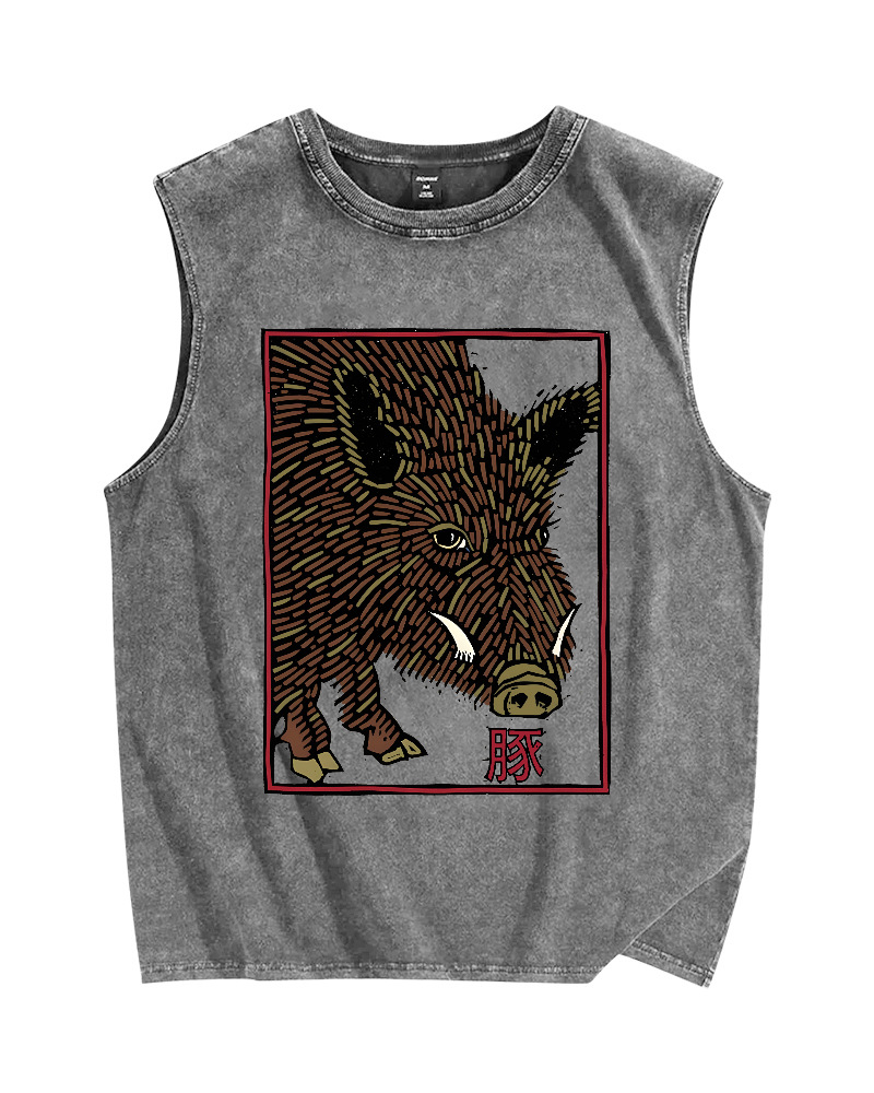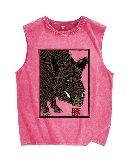 Tokyo-Assassin Woodcut Pig Vintage Distressed Washed Tank Top