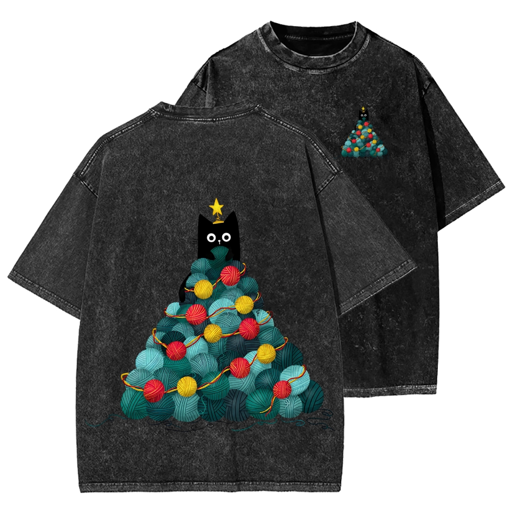 Tokyo-Assassin Yarn Christmas Tree Cat Front And Back Printing Washed T-shirt