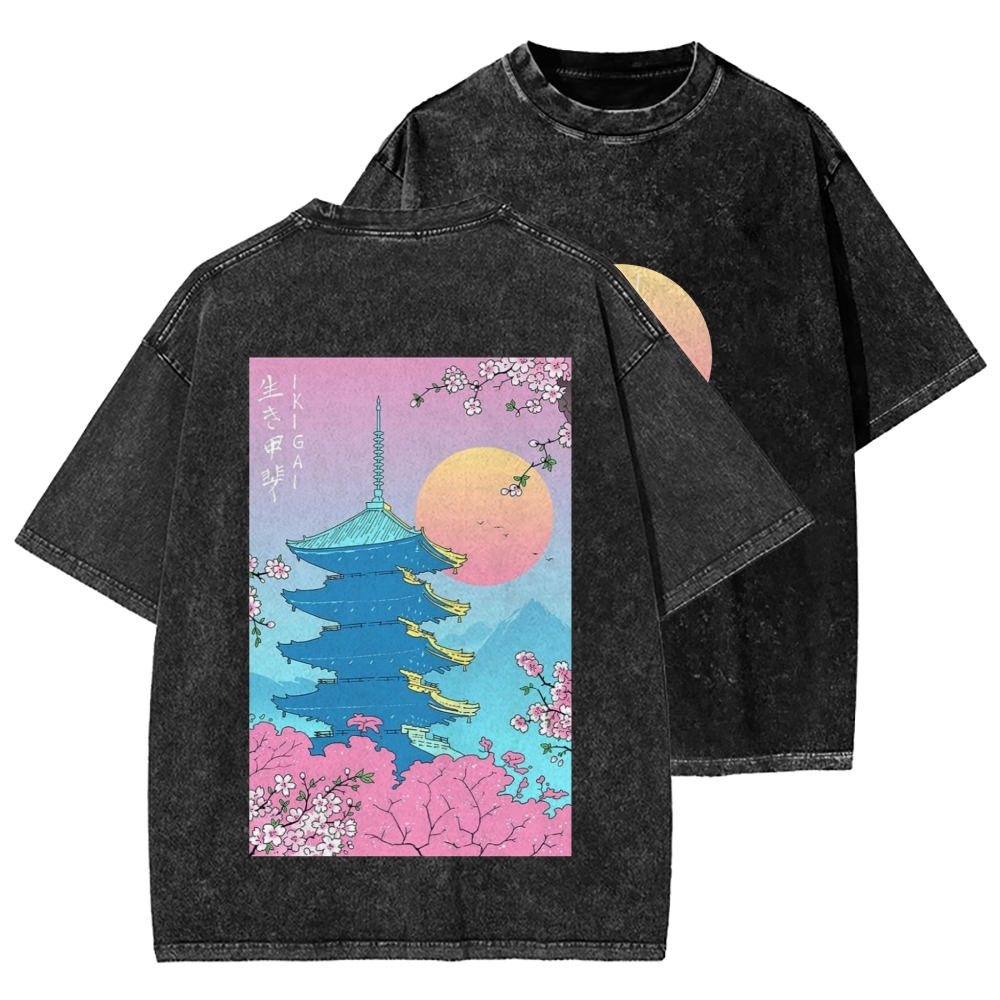 Tokyo-Assassin Cherry Blossom Front And Back Printing Washed T-shirt