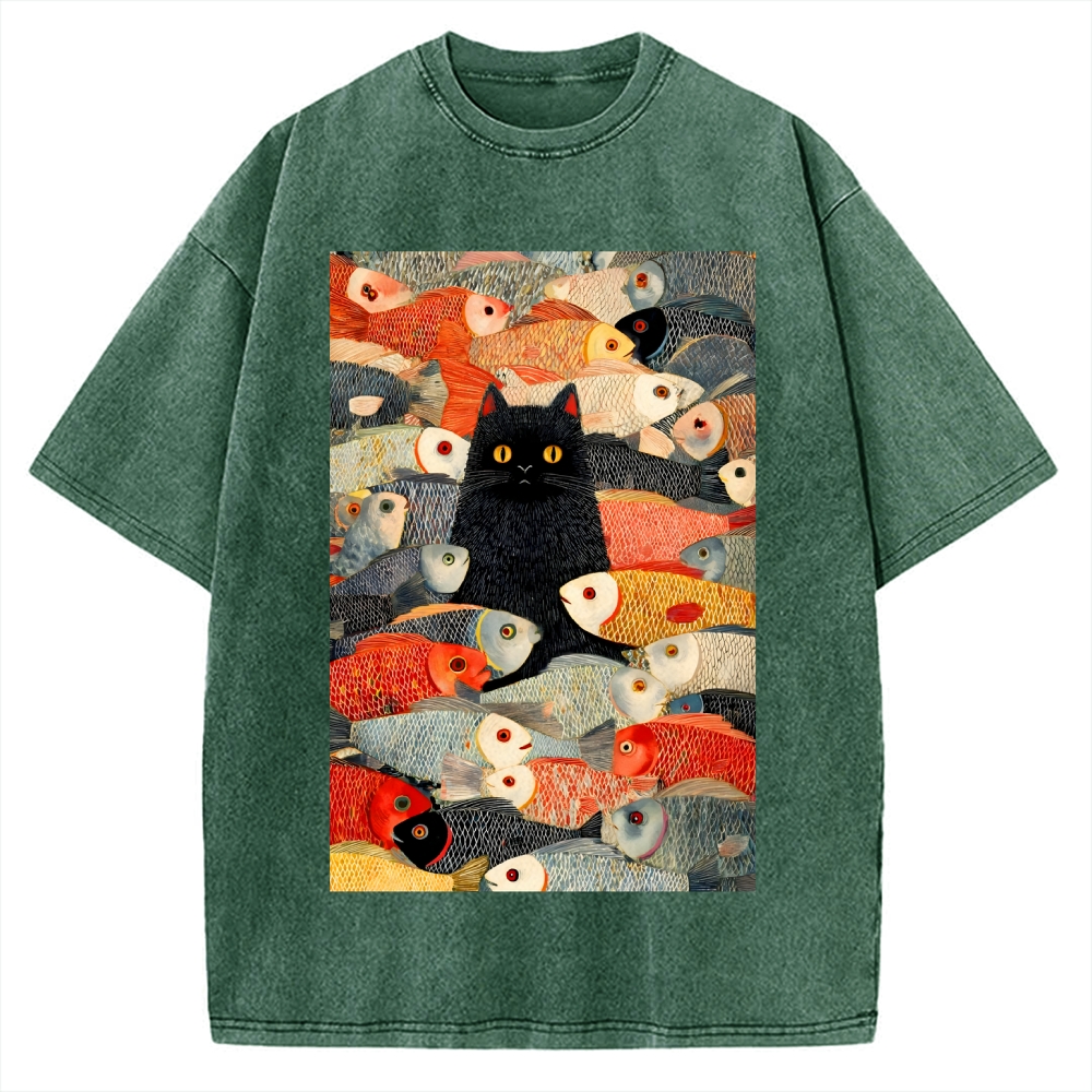 Tokyo-Assassin Japanese Black Cat Koi Fish Printed Vintage Washed T-shirt
