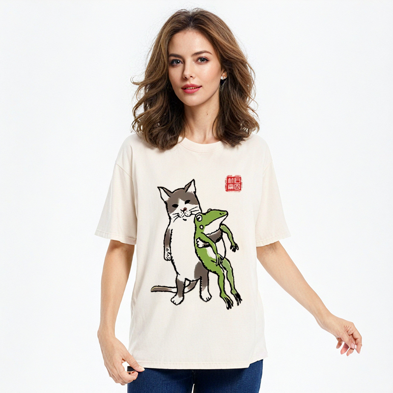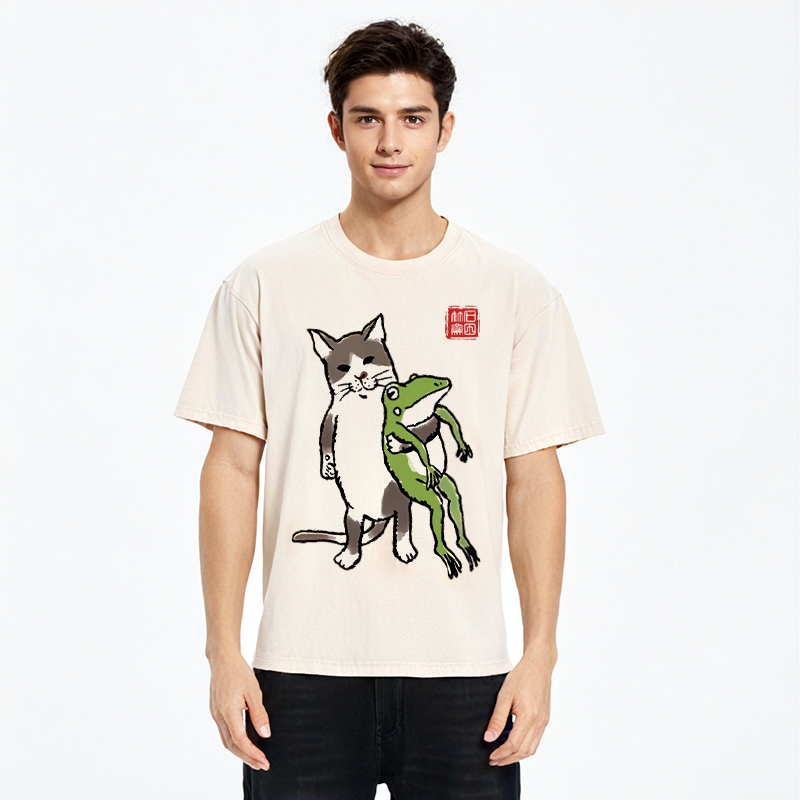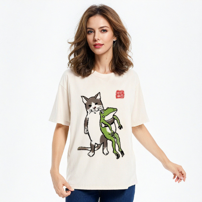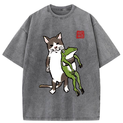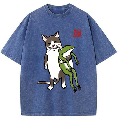 Tokyo-Assassin Cat Holding A Frog Washed T-Shirt