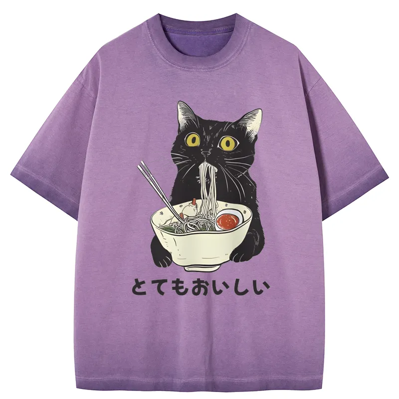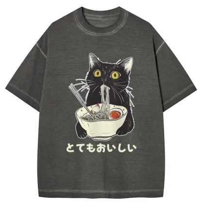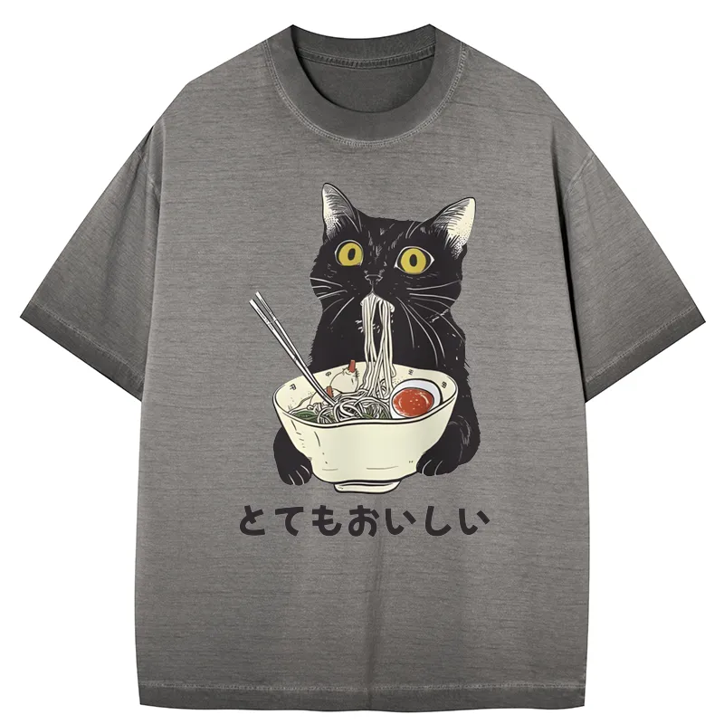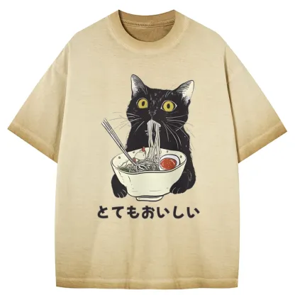 Tokyo-Assassin Cats Eat Ramen Noodles Gradient Washed T-Shirt