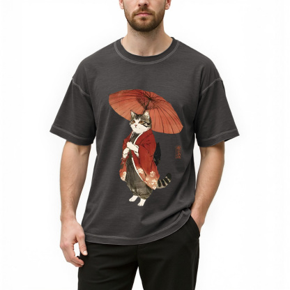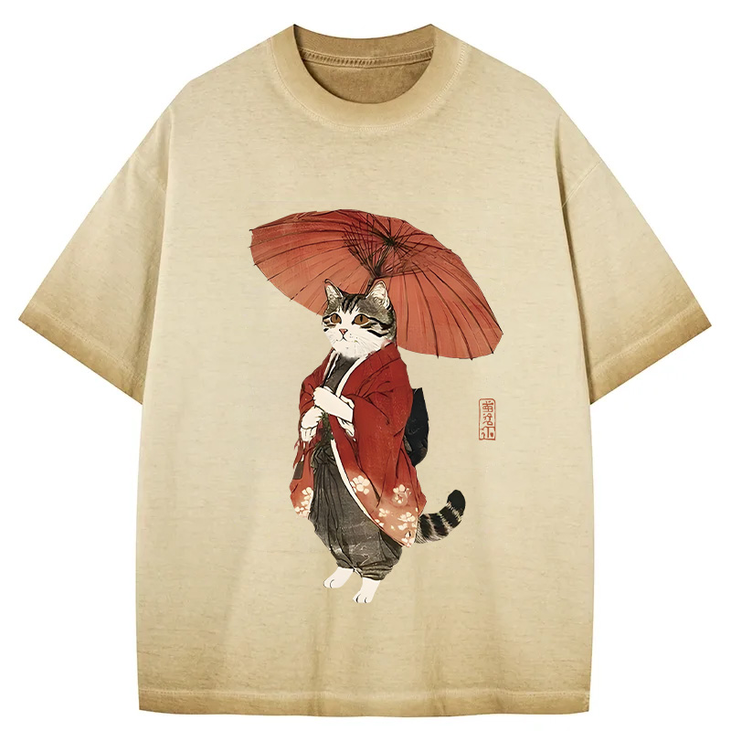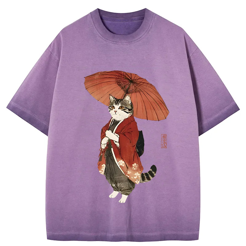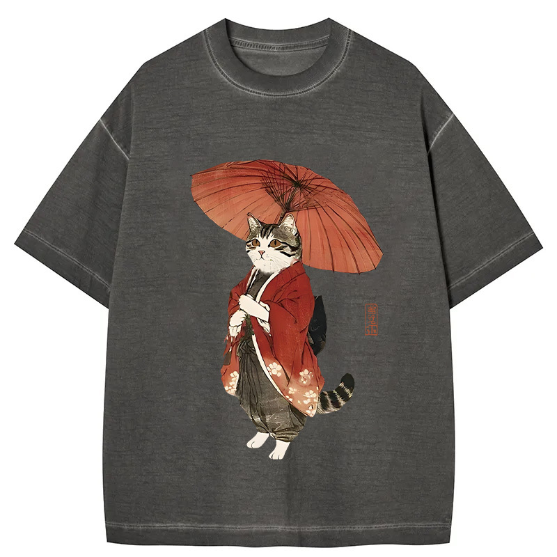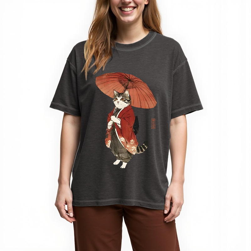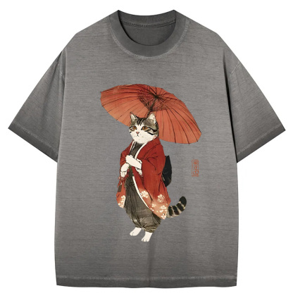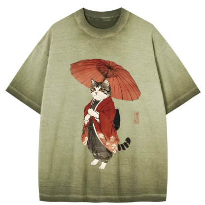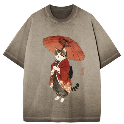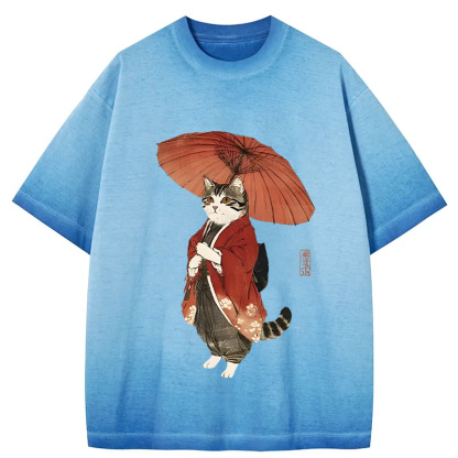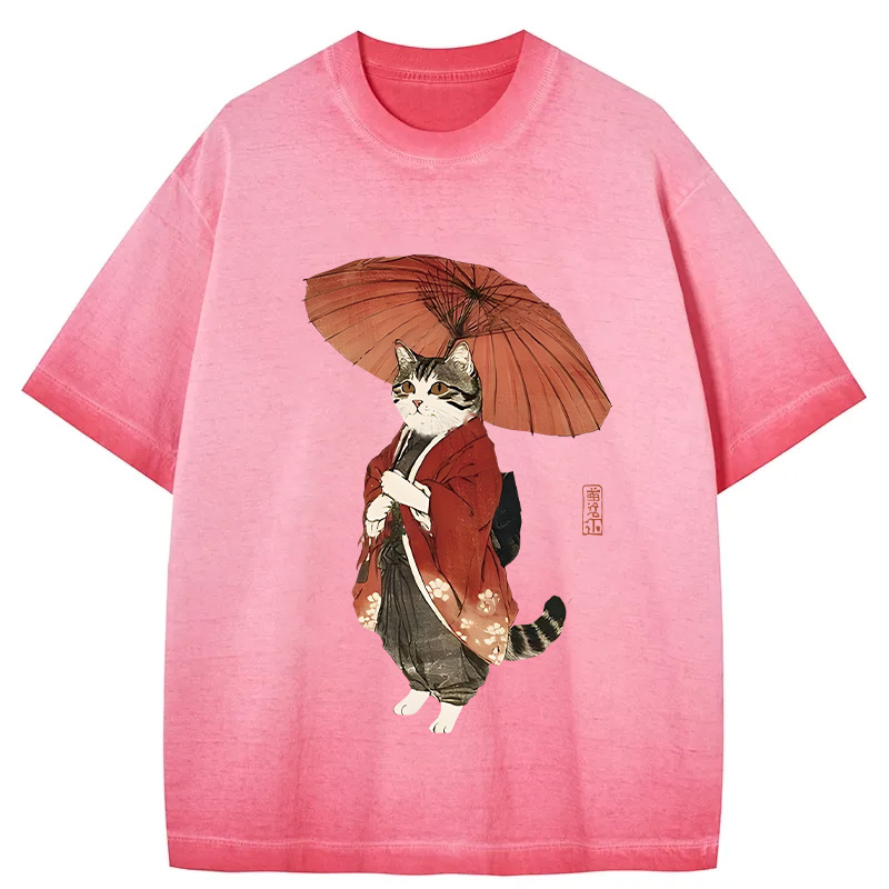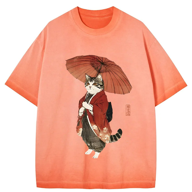 Tokyo-Assassin Elegant Cat Holding Umbrella Gradient Washed T-Shirt