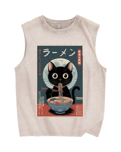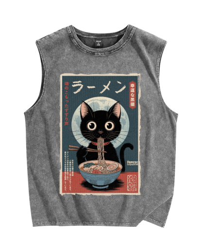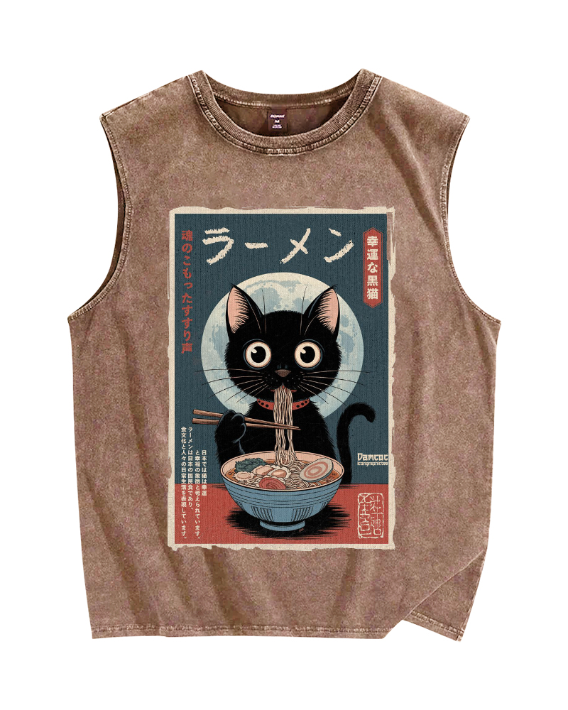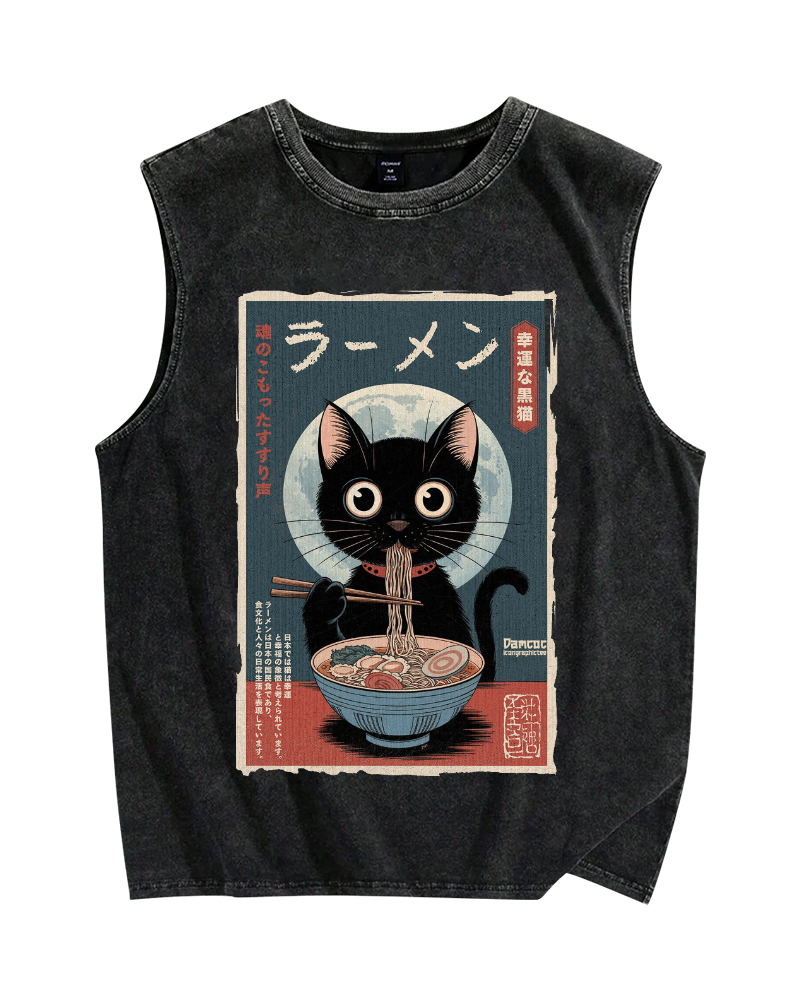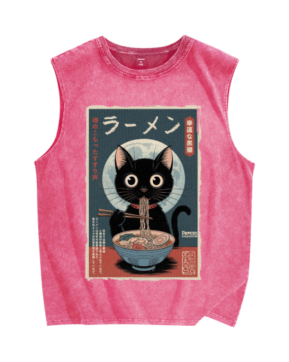 Tokyo-Assassin Black Cat Eating Ramen Vintage Distressed Washed Tank Top