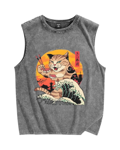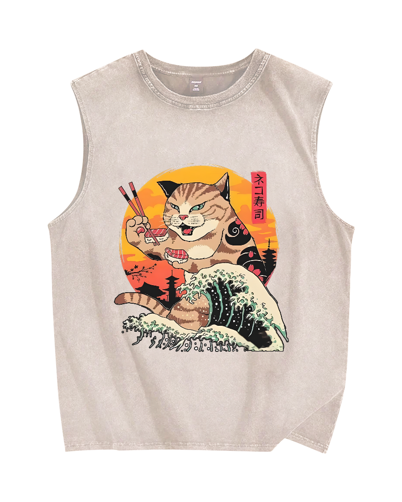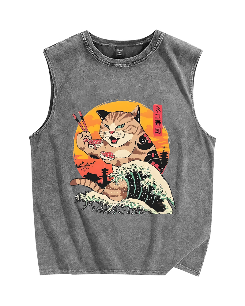 Tokyo-Assassin Cat Sushi Wave Vintage Distressed Washed Tank Top