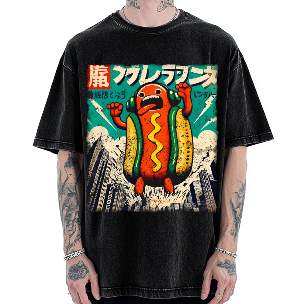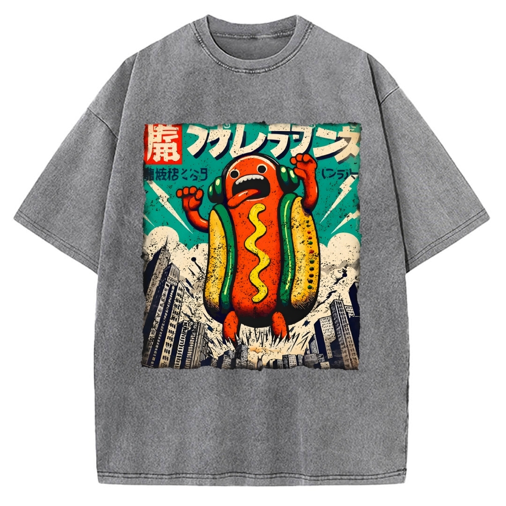 Tokyo-Assassin Funny Hot Dog Monster Attacks The City Vintage Washed T-shirt