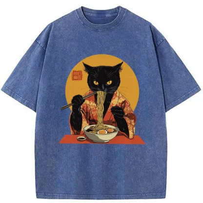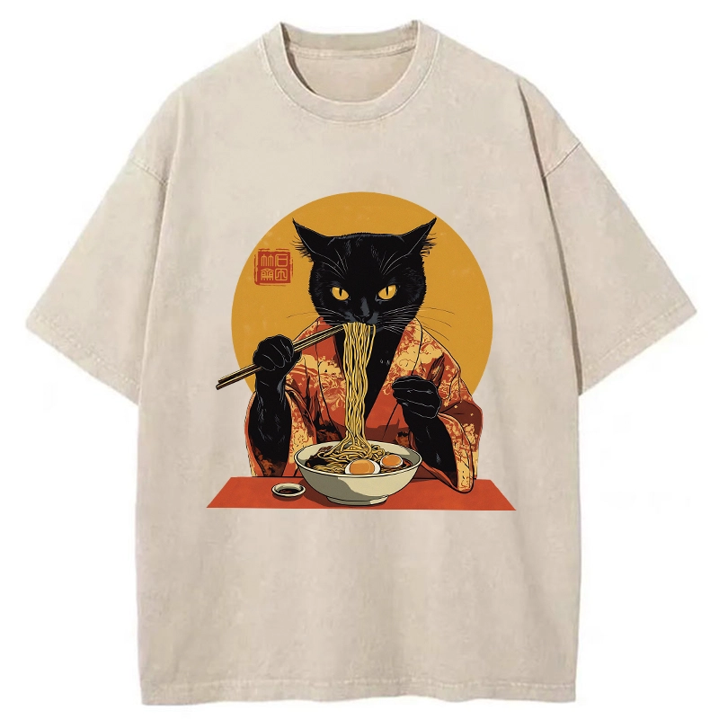 Tokyo-Assassin Ramen-obsessed Cat Washed T-Shirt