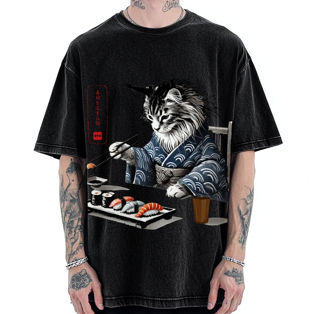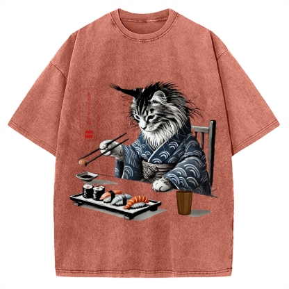 Tokyo-Assassin Cat Eating Sushi Japan Vintage Washed T-shirt