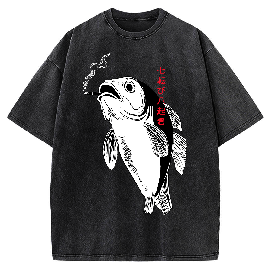 Tokyo-Assassin Japanese Kanji Fish Painting Vintage Washed T-shirt