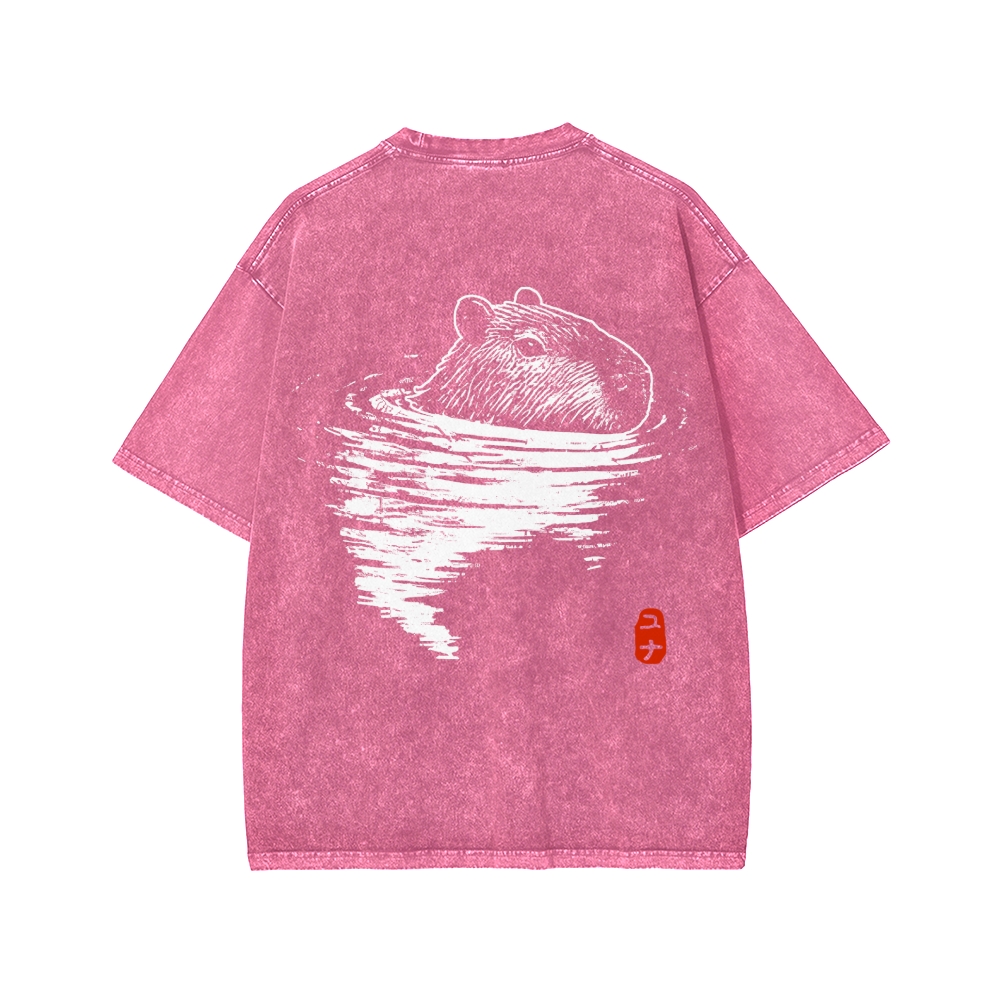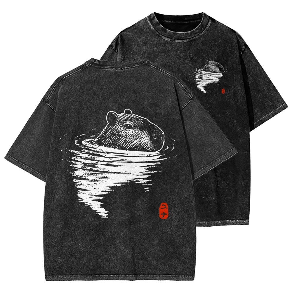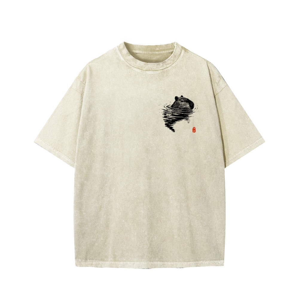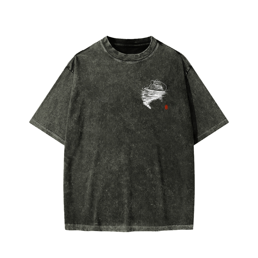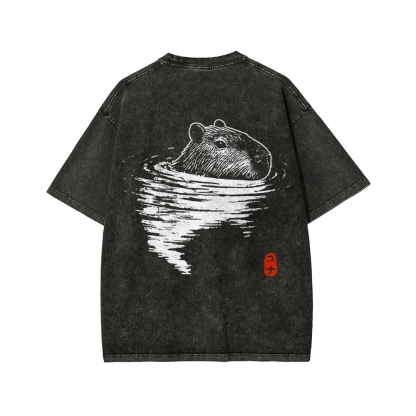 Tokyo-Assassin Swimming Capybara Front And Back Printing Washed T-shirt