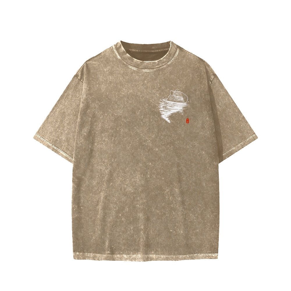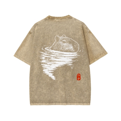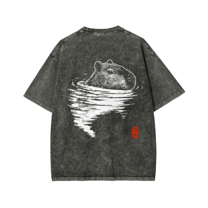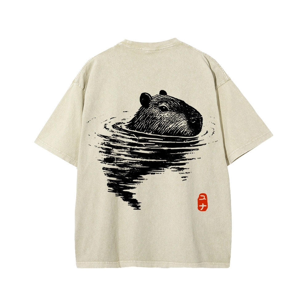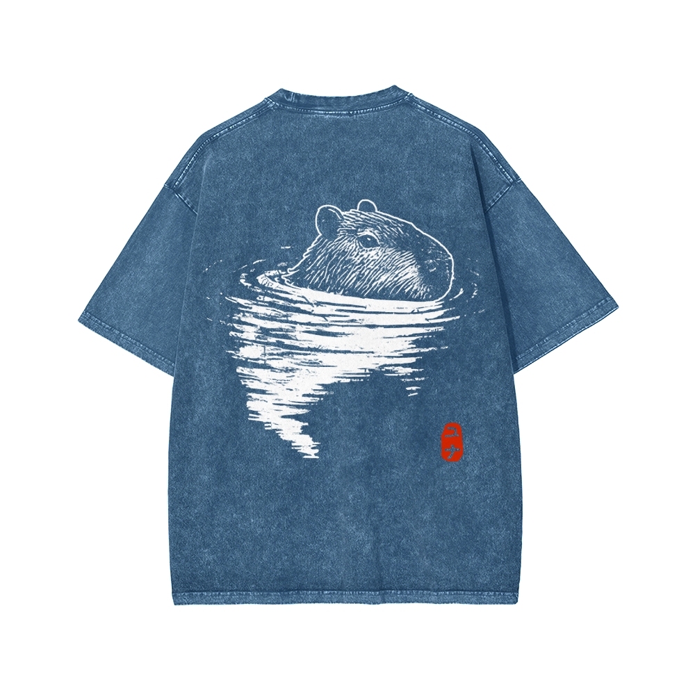 Tokyo-Assassin Swimming Capybara Front And Back Printing Washed T-shirt