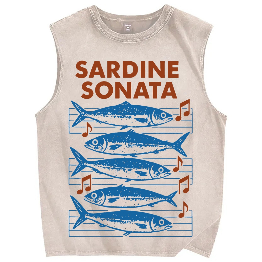 Tokyo-Assassin Sardines Sheet Music Sardine Sonata Beach Folk Art Fish Vintage Distressed Washed Tank Top