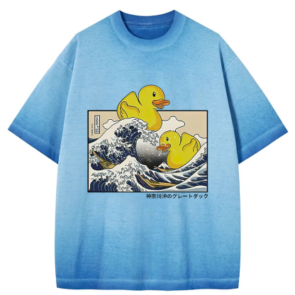 Tokyo-Assassin Ukiyoe Waves And Cute Yellow Duck Gradient Washed T-Shirt