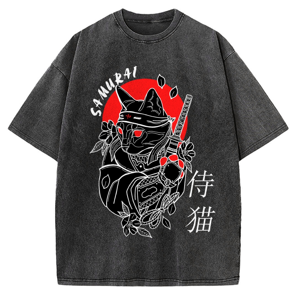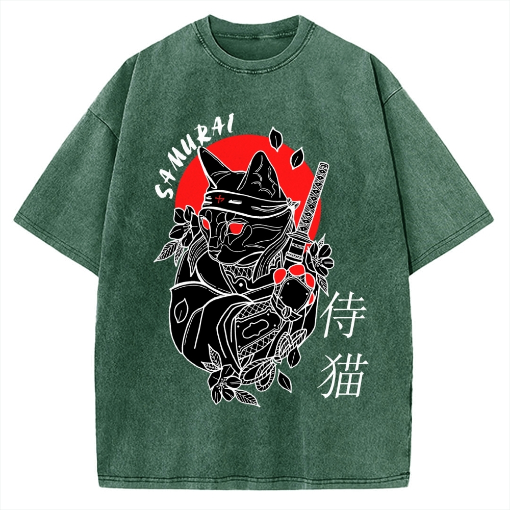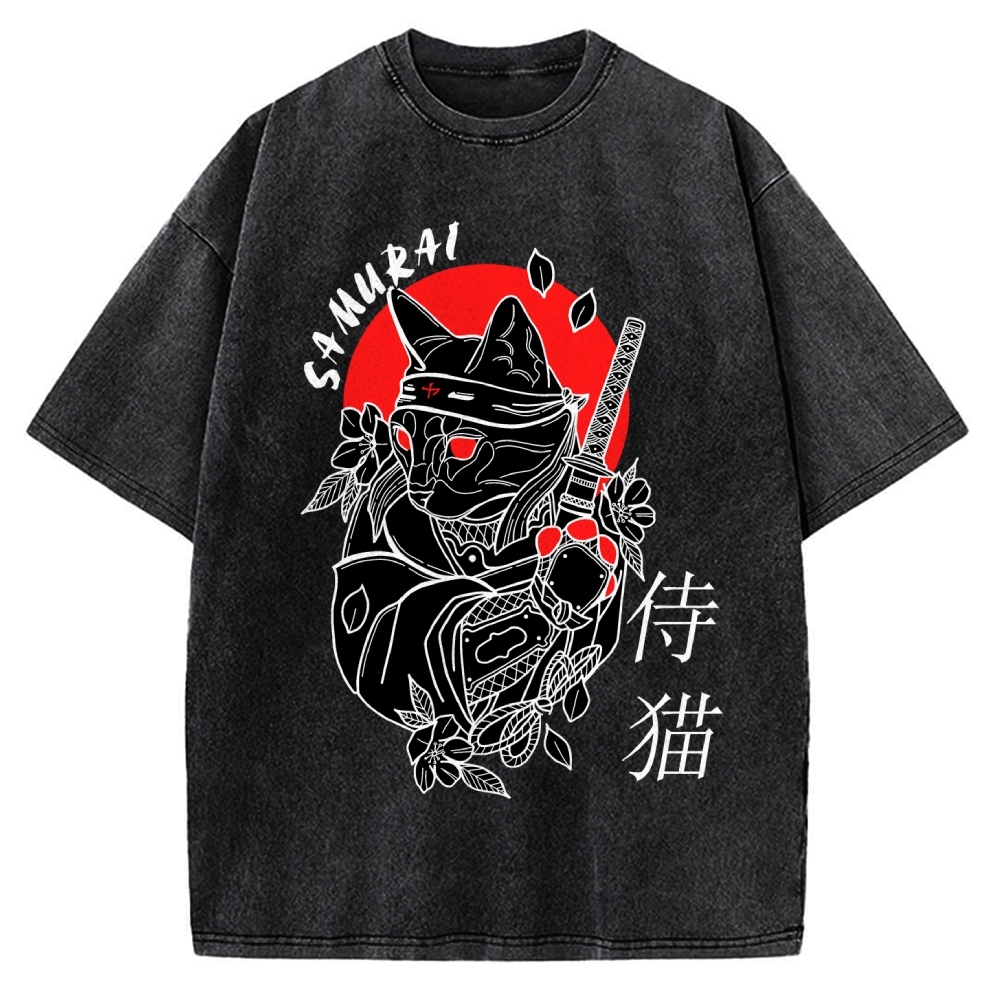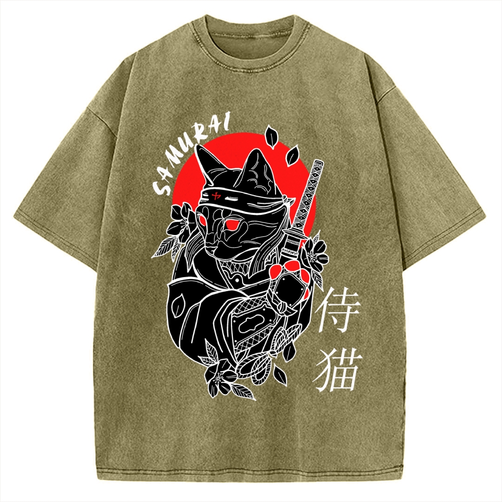 Tokyo-Assassin Japanese Samurai Cat Vintage Washed T-shirt