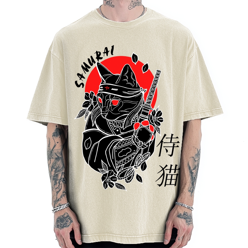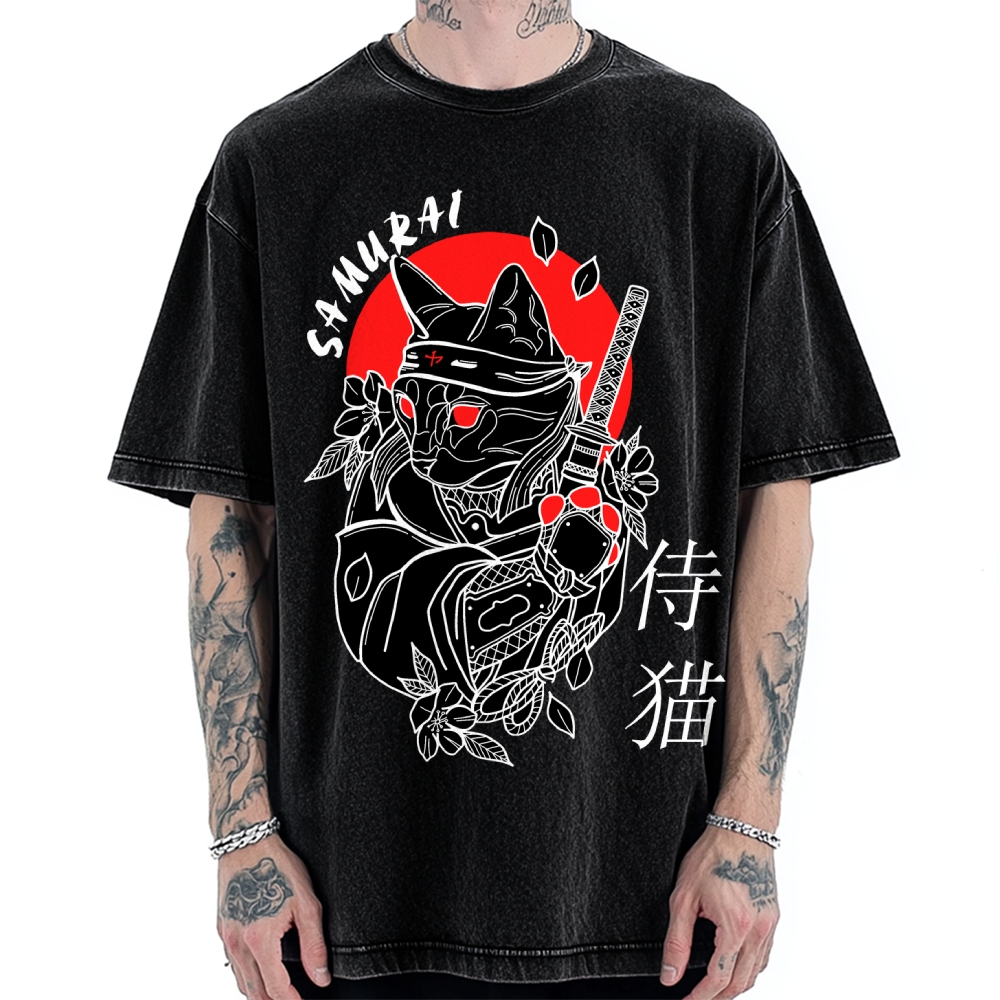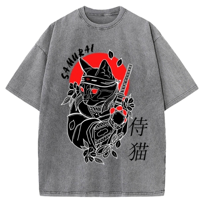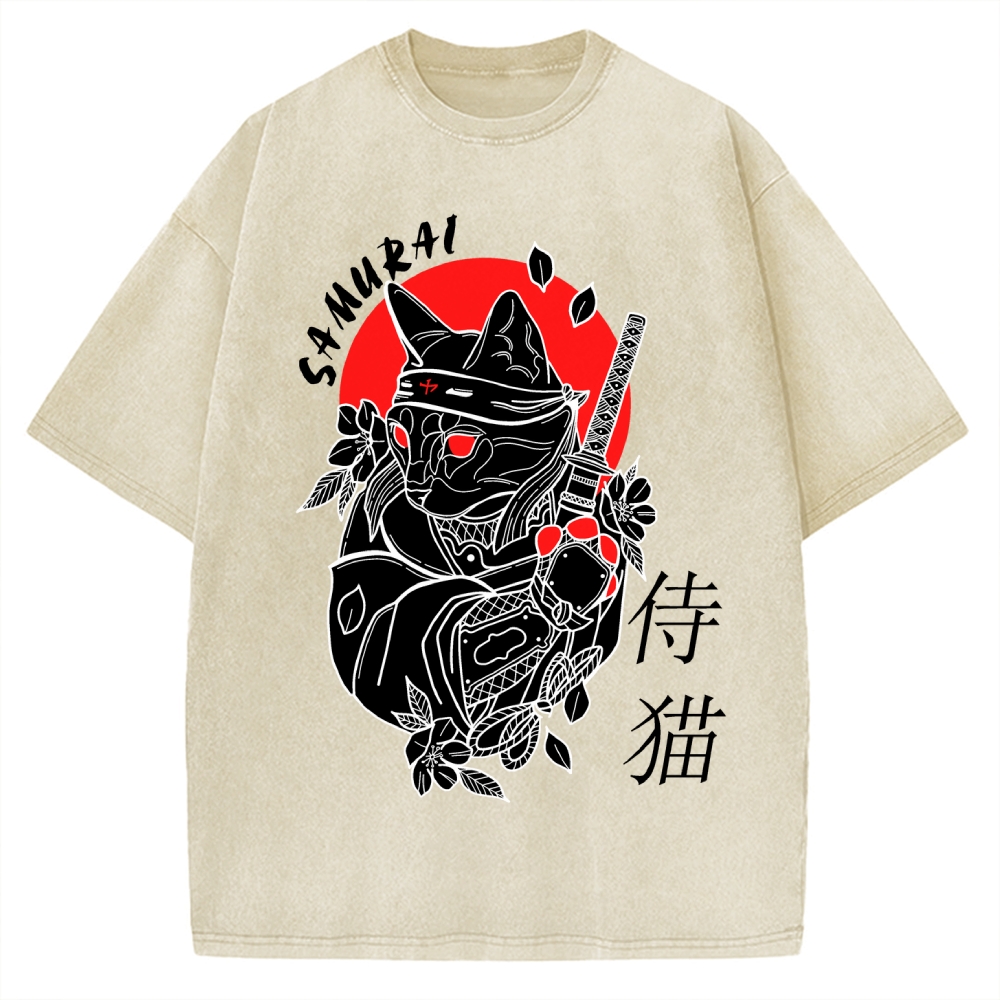 Tokyo-Assassin Japanese Samurai Cat Vintage Washed T-shirt