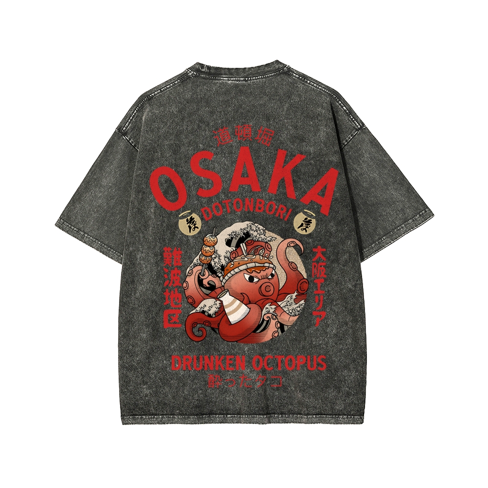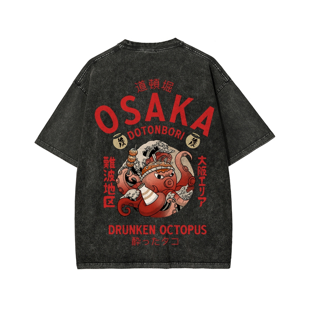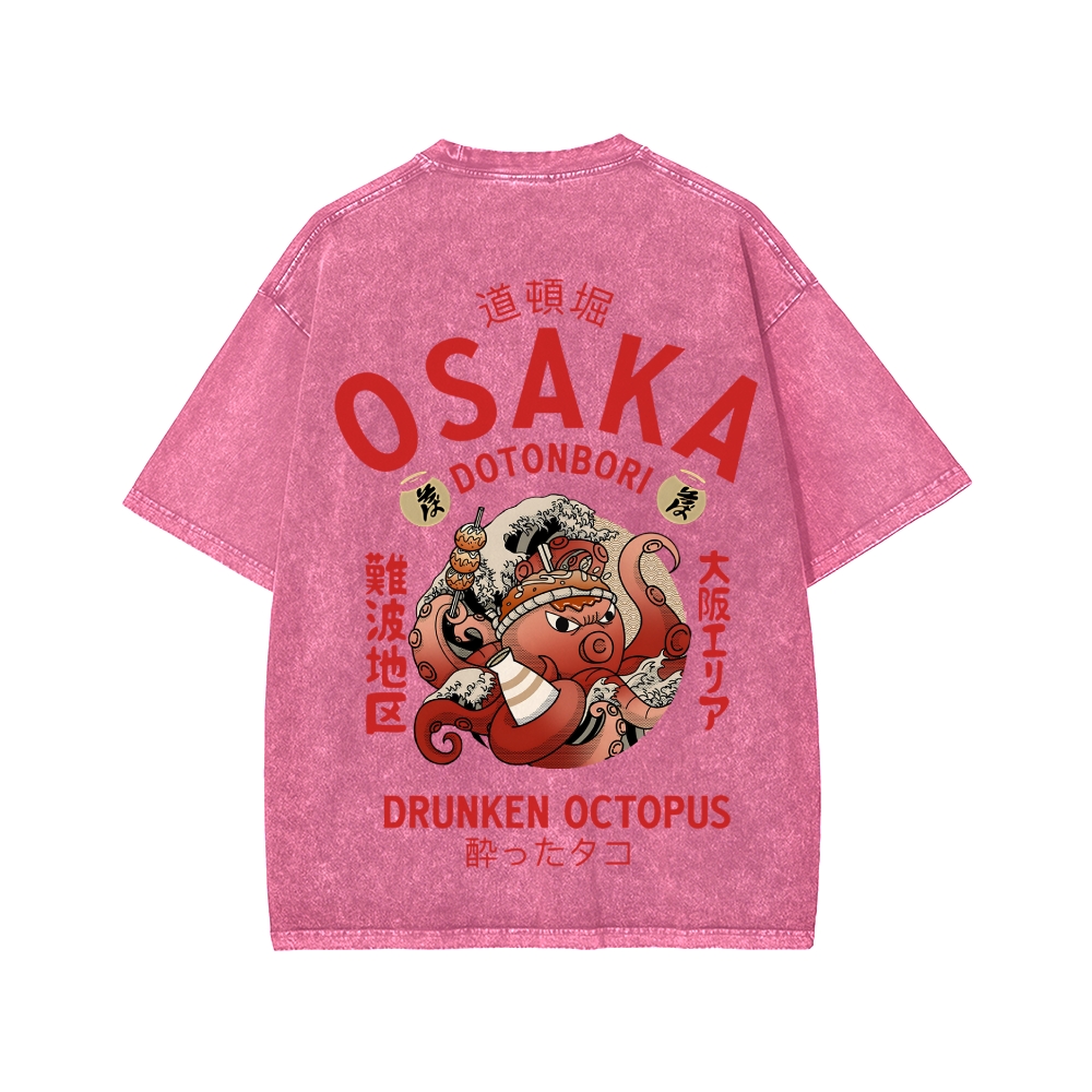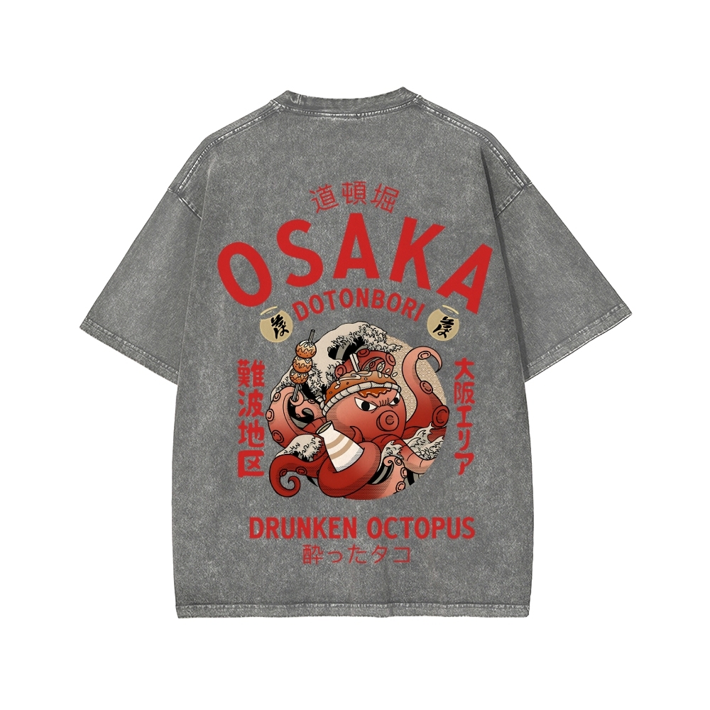 Tokyo-Assassin Osaka Drunken Octopus Front And Back Printing Washed T-shirt
