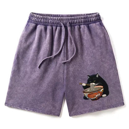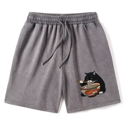 Tokyo-Assassin Fat Cat Eating Ramen Washed Shorts