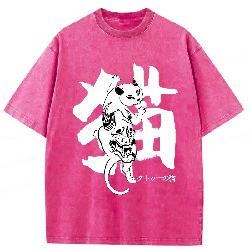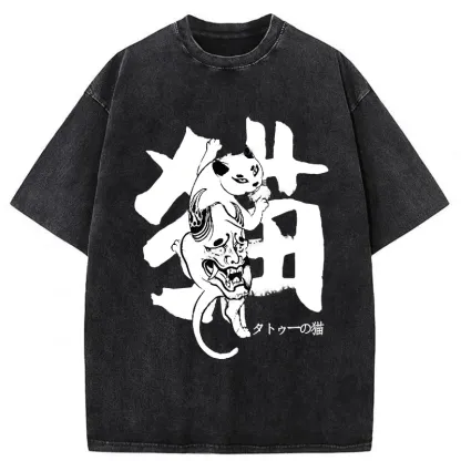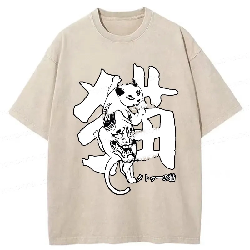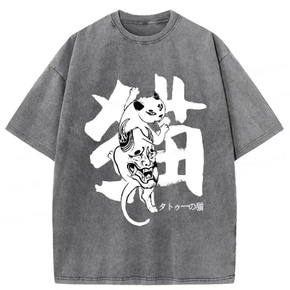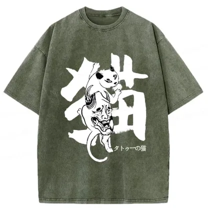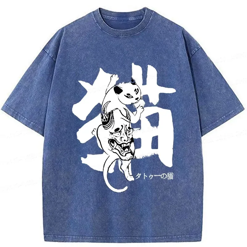 Tokyo-Assassin Cat With Oni Mask Tattoo Washed T-Shirt