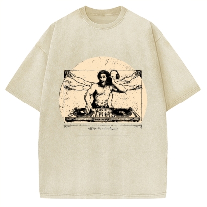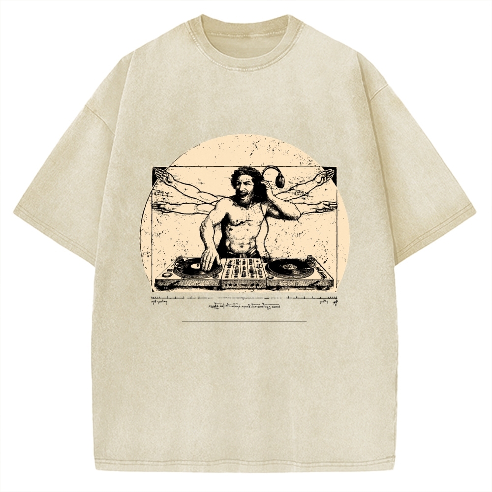 Tokyo-Assassin Vitruvian DJ T-Shirt Funny Da Vinci Music Mashup Vintage Washed T-shirt