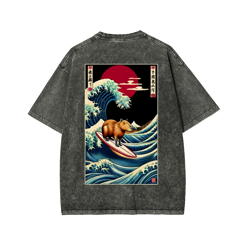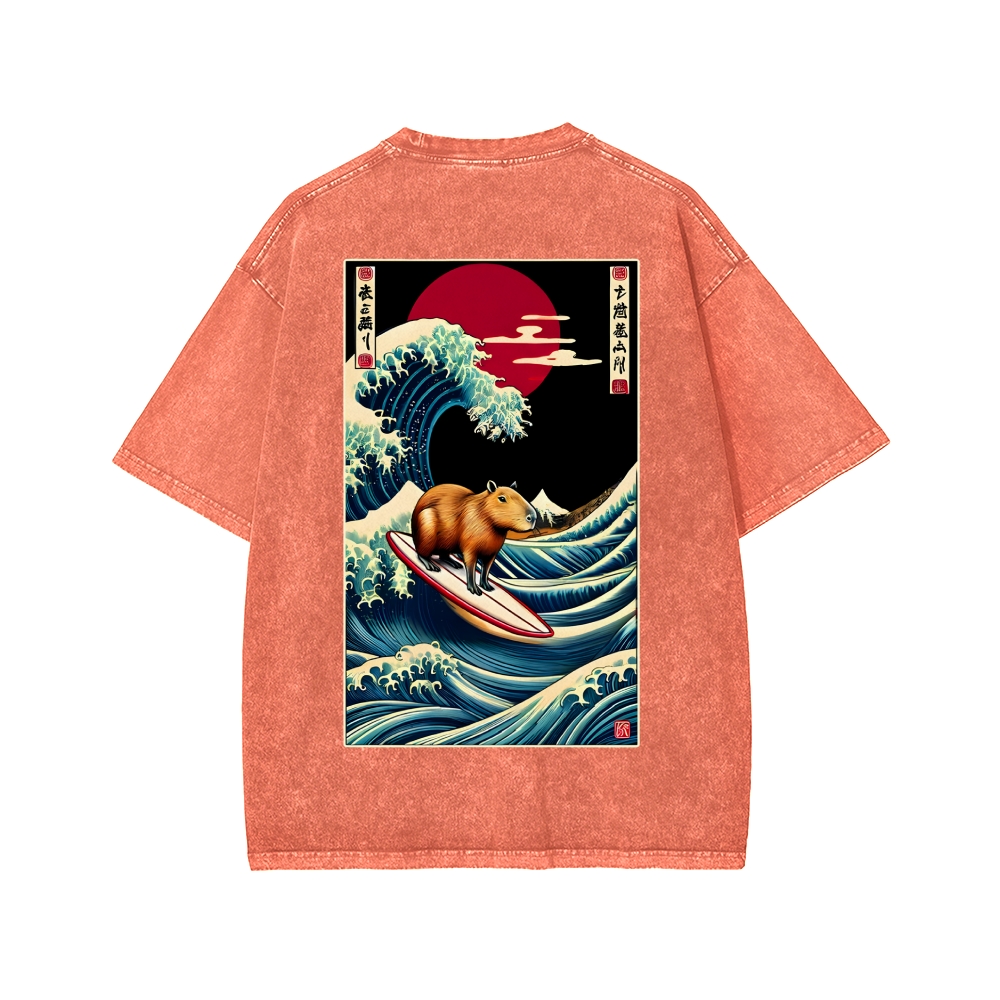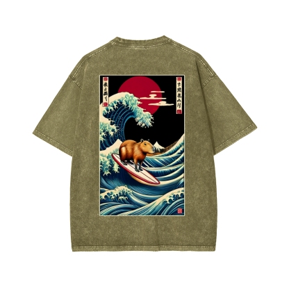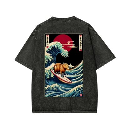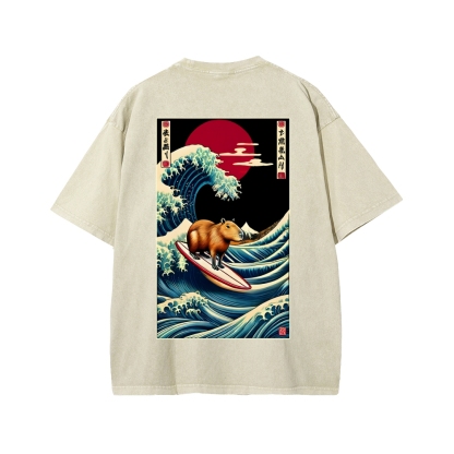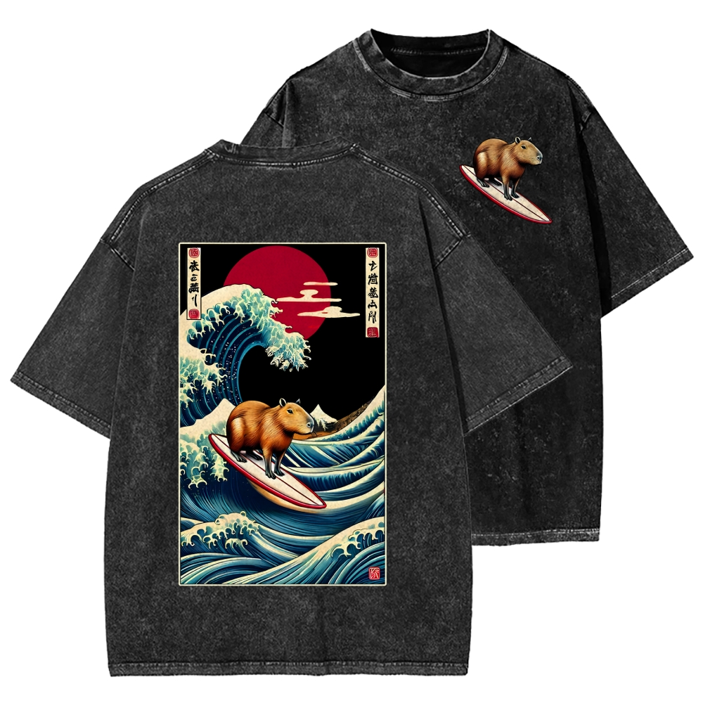 Tokyo-Assassin Capybara Kanagawa Wave Surf Japanese Art Printing Front And Back Printing Washed T-shirt
