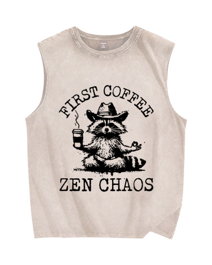 Tokyo-Assassin First Coffee Zen Chaos Raccoon Vintage Distressed Washed Tank Top