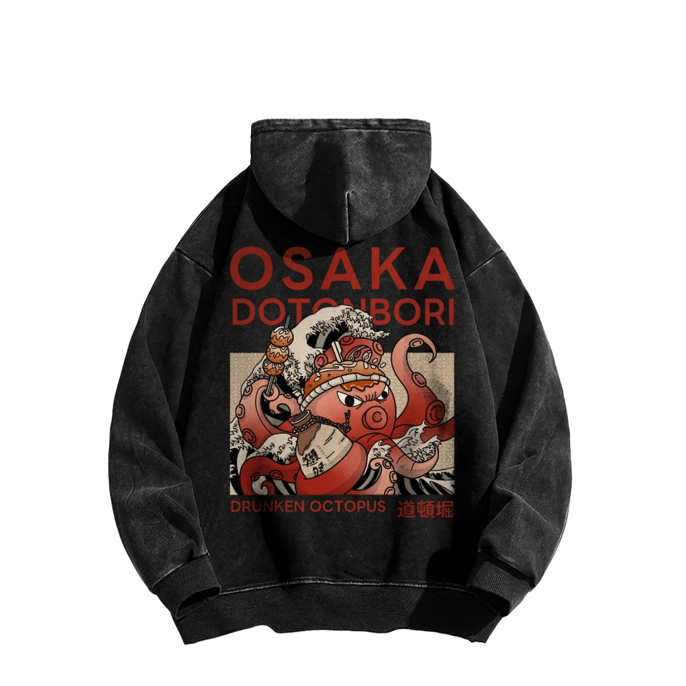 Tokyo-Assassin Osaka Dotonbori Drunken Octopus Front And Back Printing Vintage Washed Hoodie