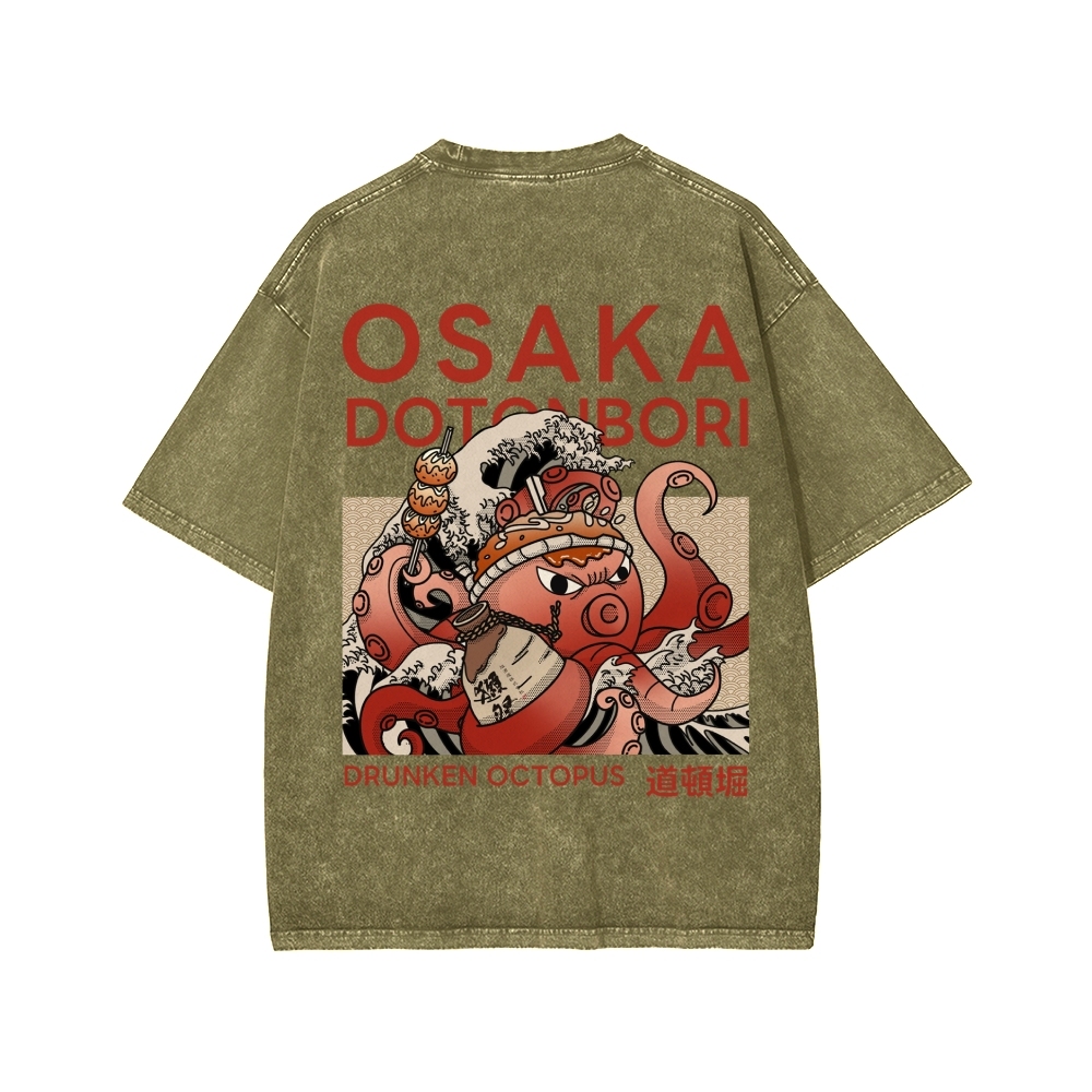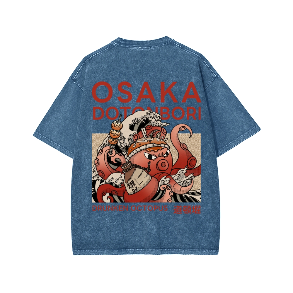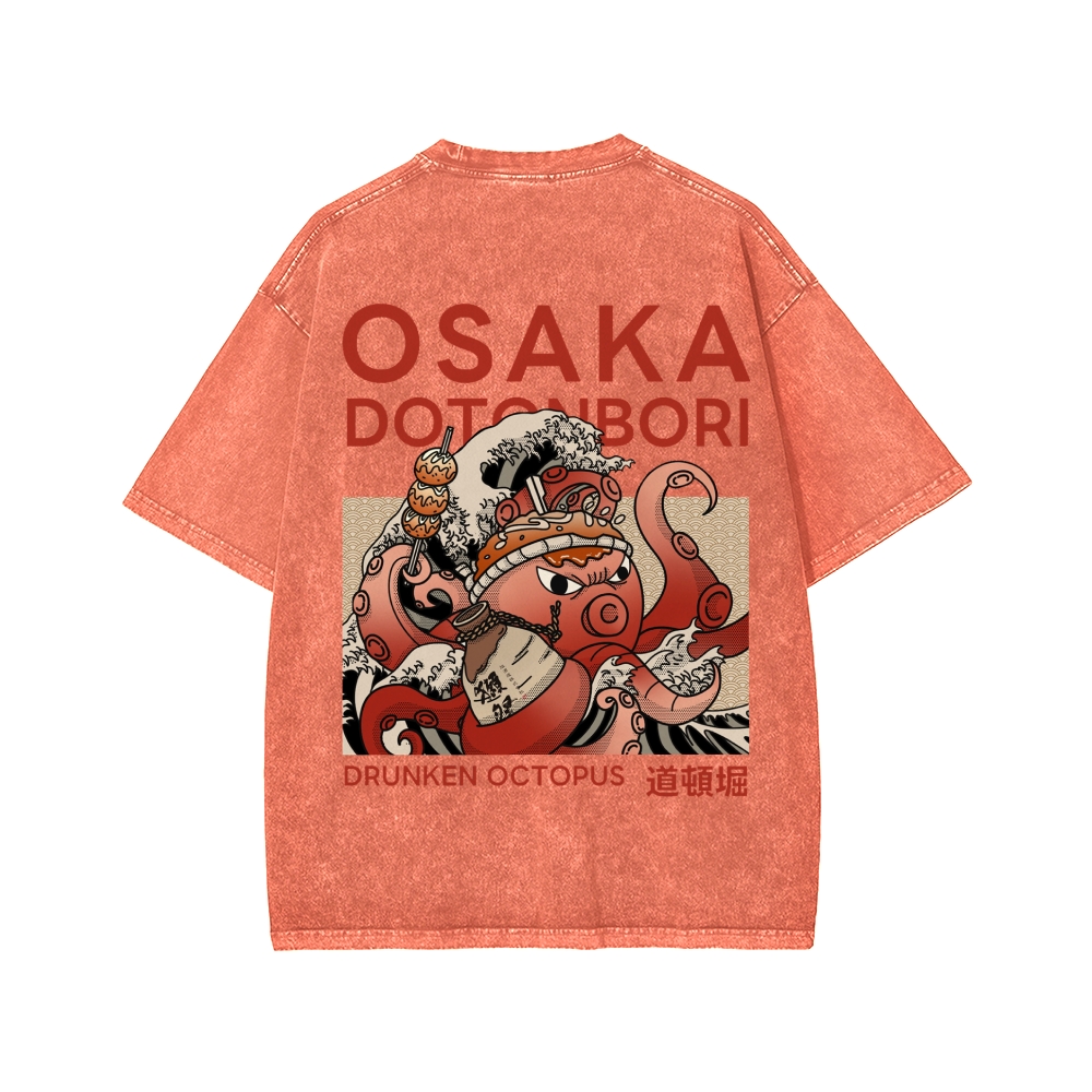 Tokyo-Assassin Osaka Dotonbori Drunken Octopus Front And Back Printing Washed T-shirt
