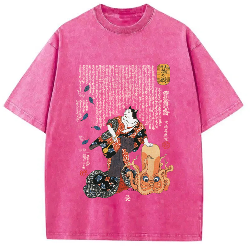 Tokyo-Assassin Japanese Cat and Octopus Art Washed T-Shirt