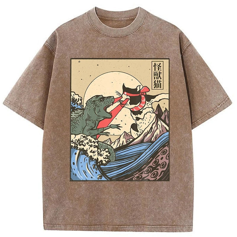 Tokyo-Assassin Japanese Great Wave Cat VS Monster Washed T-Shirt