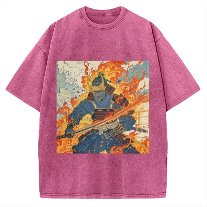 Tokyo-Assassin Warrior in Flame Ukiyo-e Style Japanese Traditional Vintage Washed T-shirt