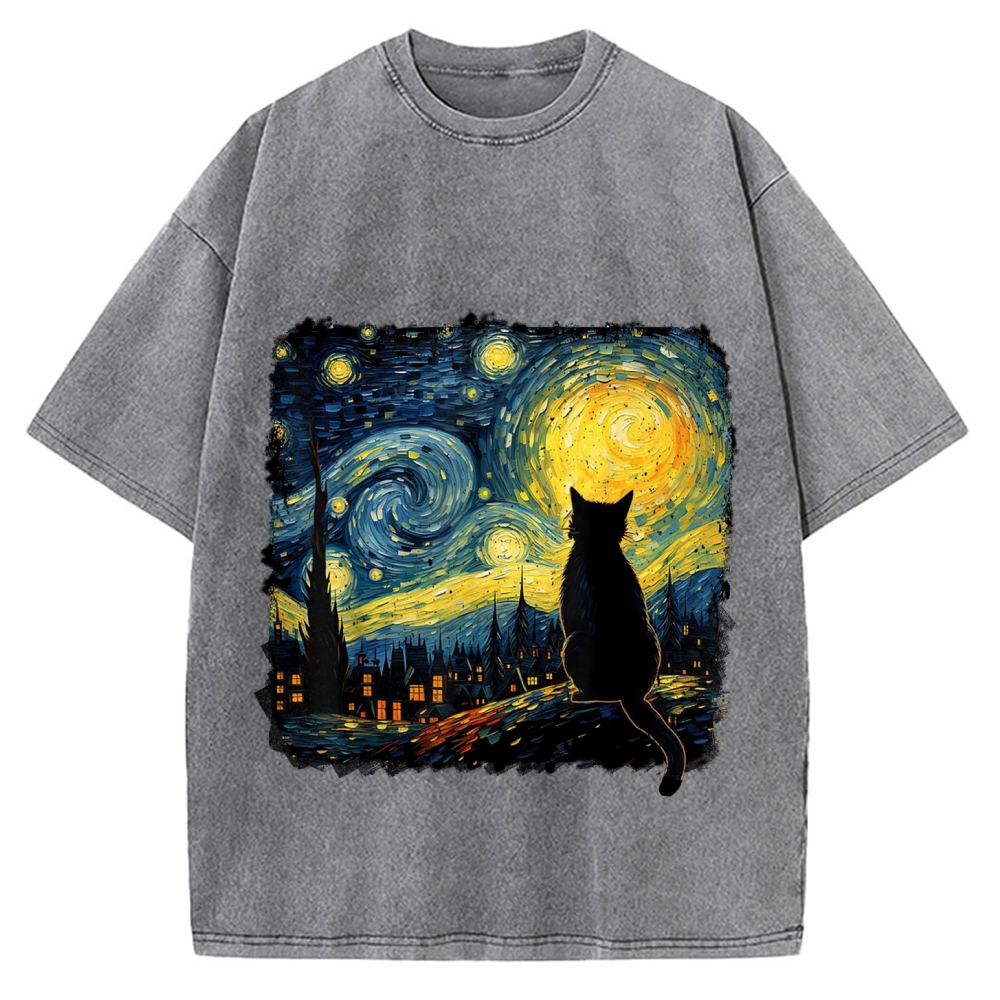 Tokyo-Assassin The Starry Night And Cat Vintage Washed T-shirt