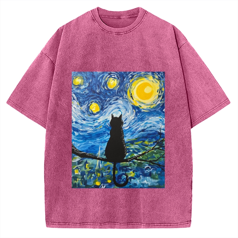 Tokyo-Assassin The Starry Night And Cat Vintage Washed T-shirt