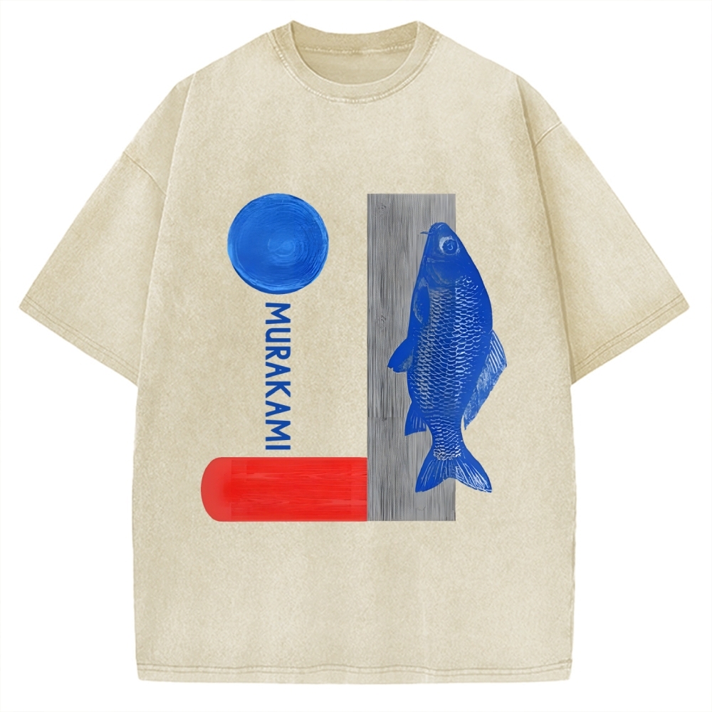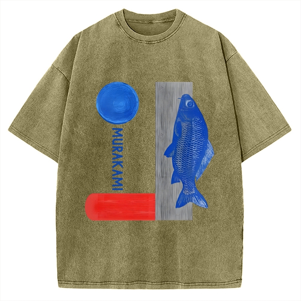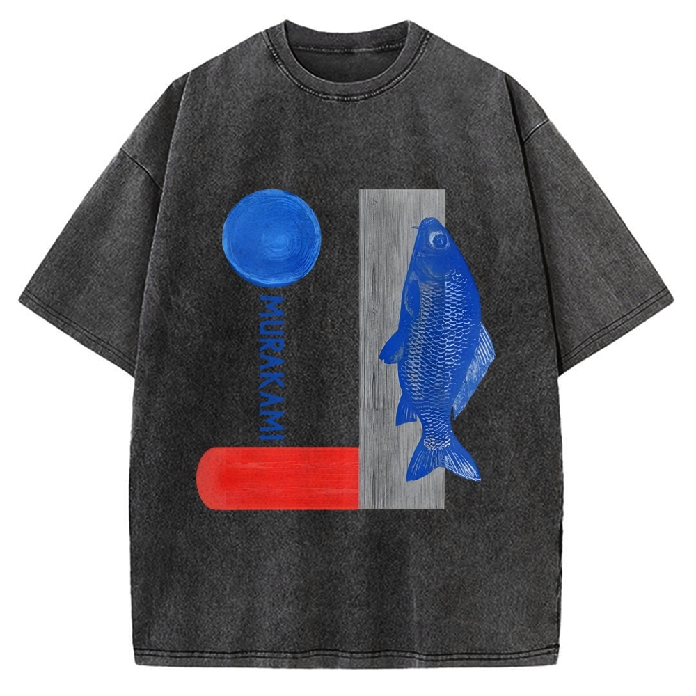 Tokyo-Assassin Japanese Fish And Book Printed Vintage Washed T-shirt