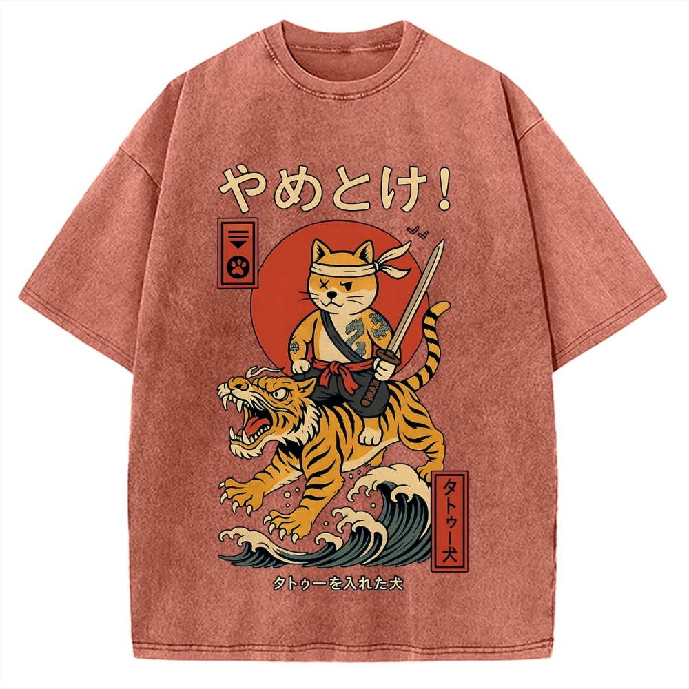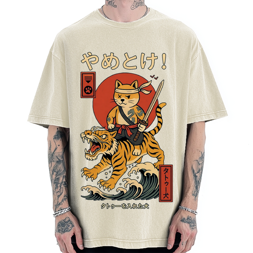 Tokyo-Assassin Cat Riding Tiger Japanese Style Wave Vintage Washed T-shirt