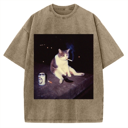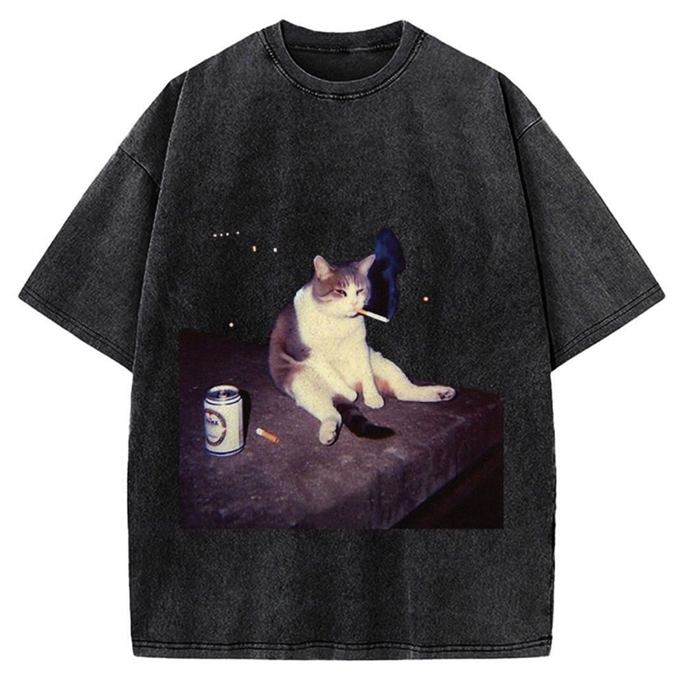 Tokyo-Assassin Cigarette Cat Beer Vintage Washed T-shirt