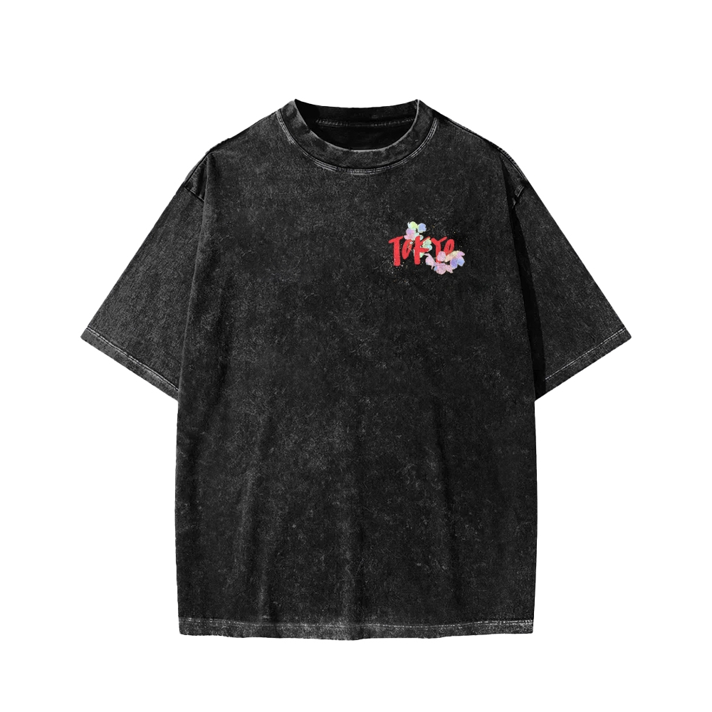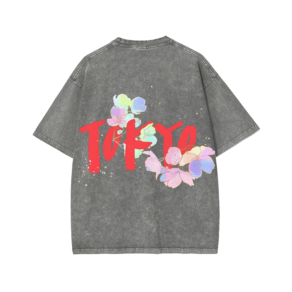 Tokyo-Assassin Colorful Sakura Petals Tokyo Front And Back Printing Washed T-shirt