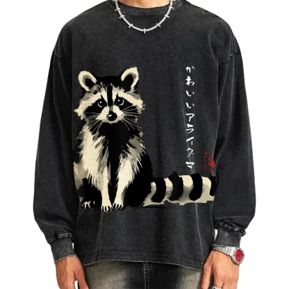 Tokyo-Assassin Kawaii Raccoon Anime Japanese Ink Style Funny Raccoon Vintage Washed Sweatshirts