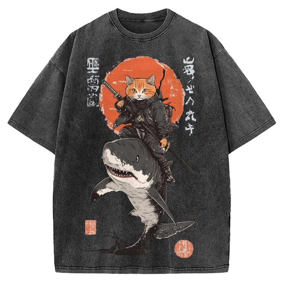 Tokyo-Assassin Ninja cat riding a shark Ukiyo-E Style Vintage Washed T-shirt