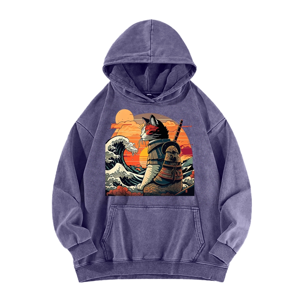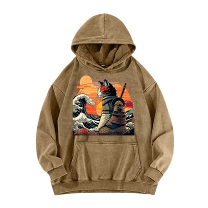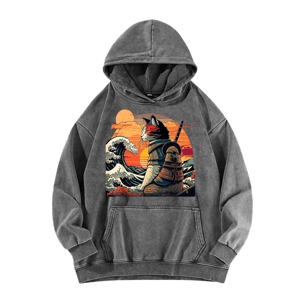 Tokyo-Assassin Samurai Cat & Wave Vintage Washed Hoodie
