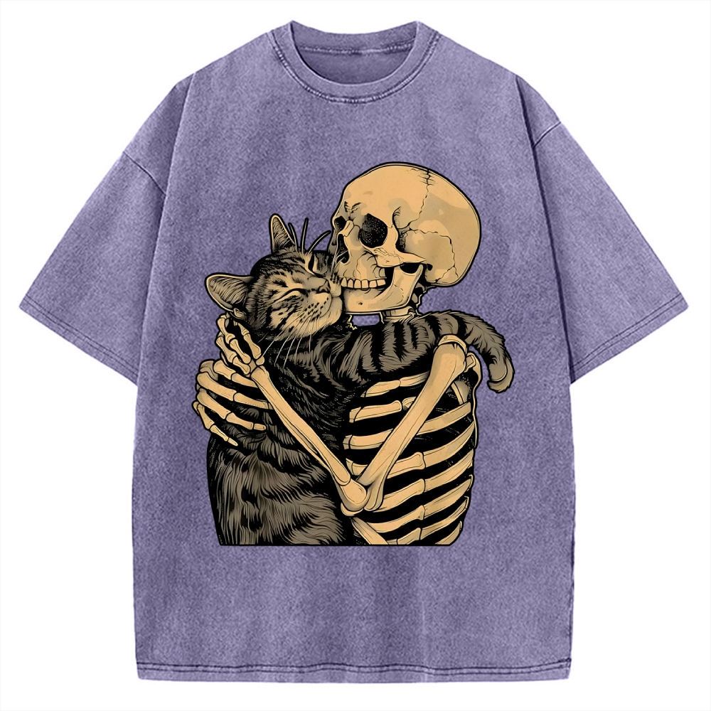 Tokyo-Assassin Skeleton Hugging Cat Vintage Washed T-shirt