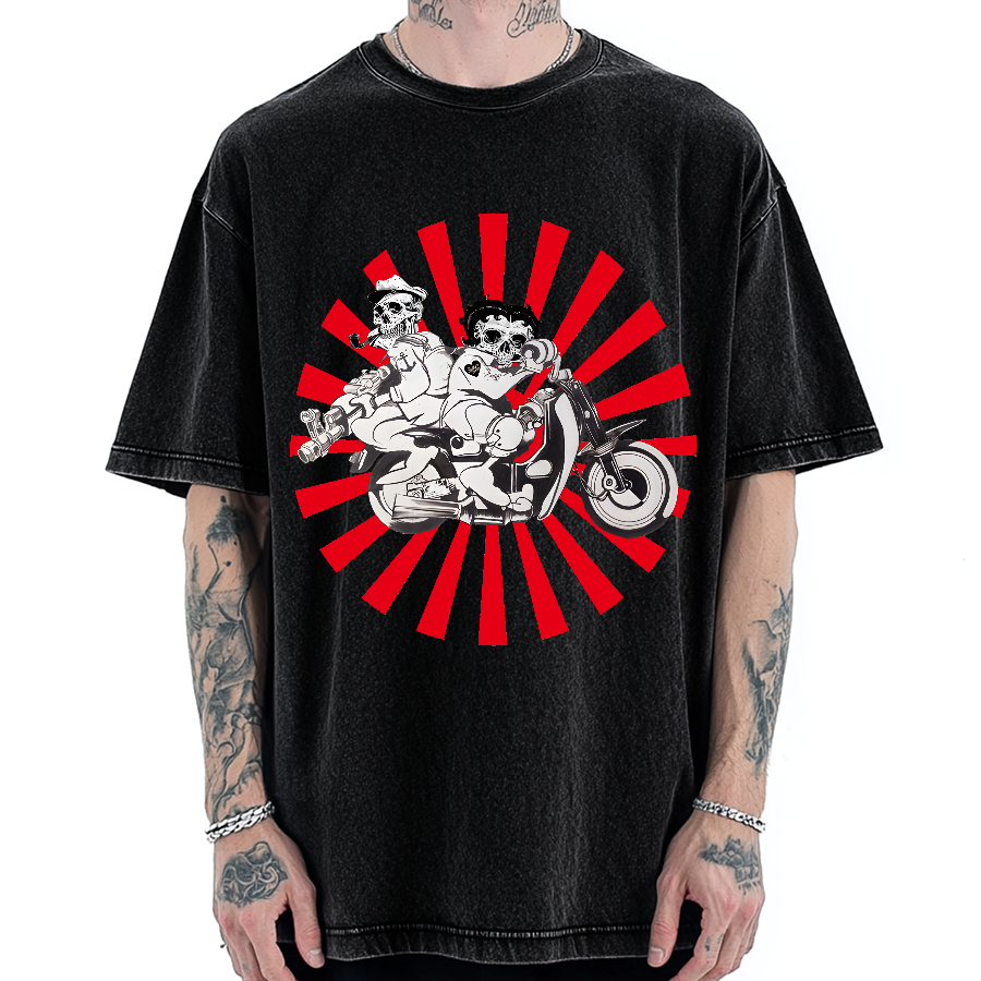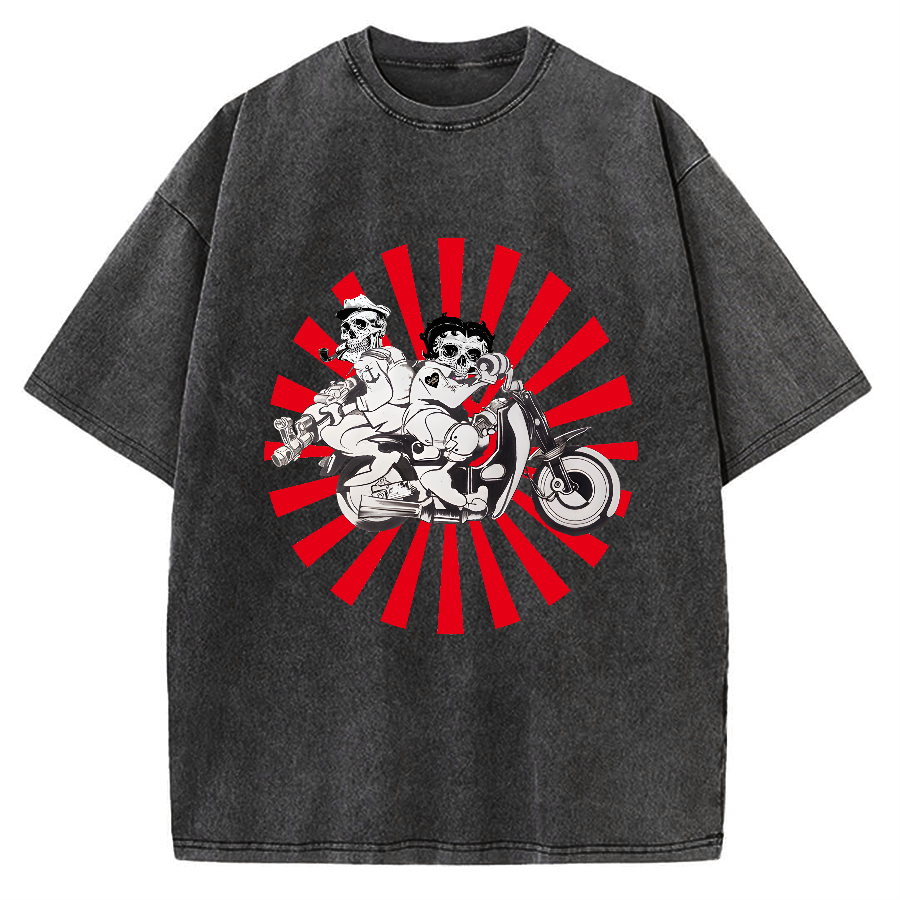 Tokyo-Assassin Skeleton Riding Motorcycle Vintage Washed T-shirt