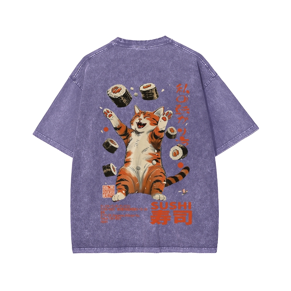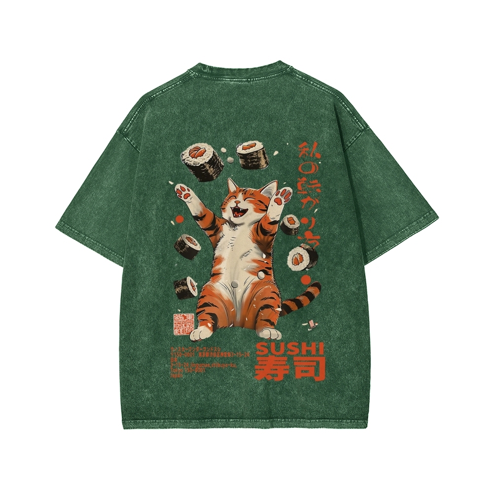 Tokyo-Assassin Sushi Lover Cat Japanese Kanji Front And Back Printing Washed T-shirt
