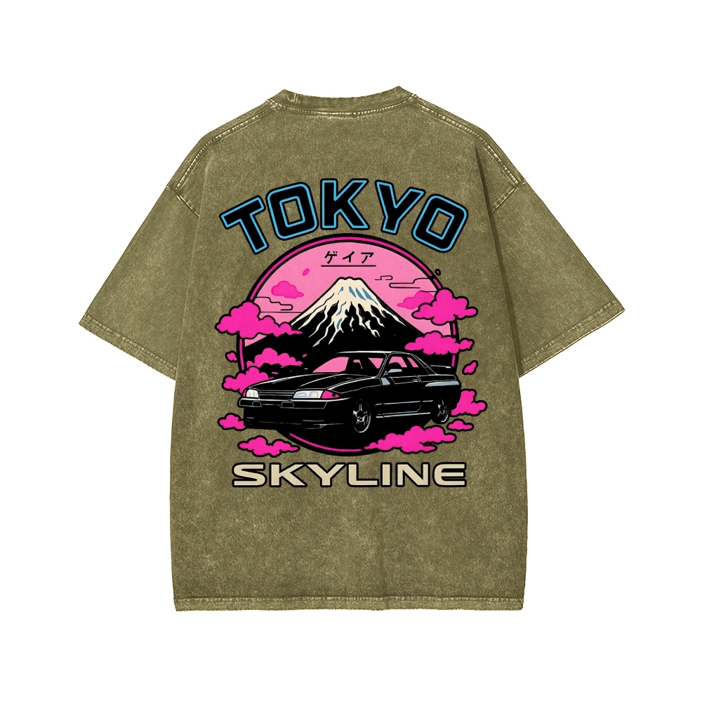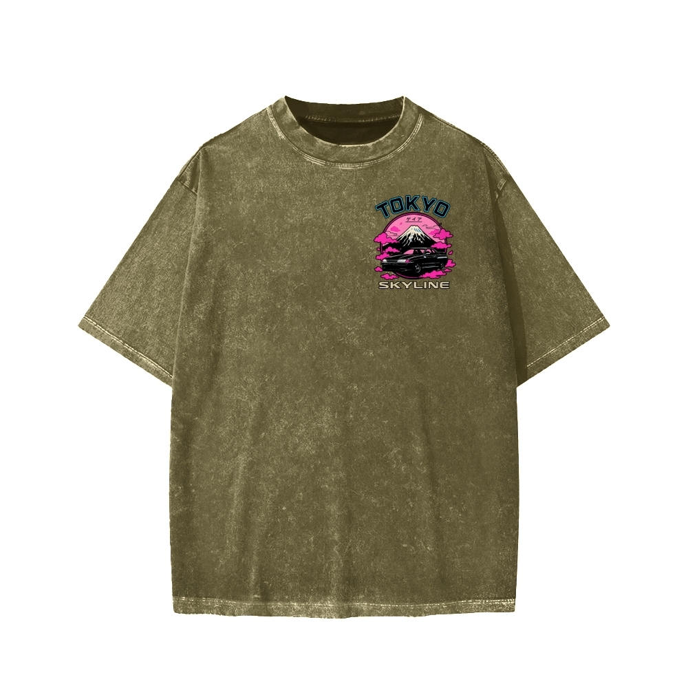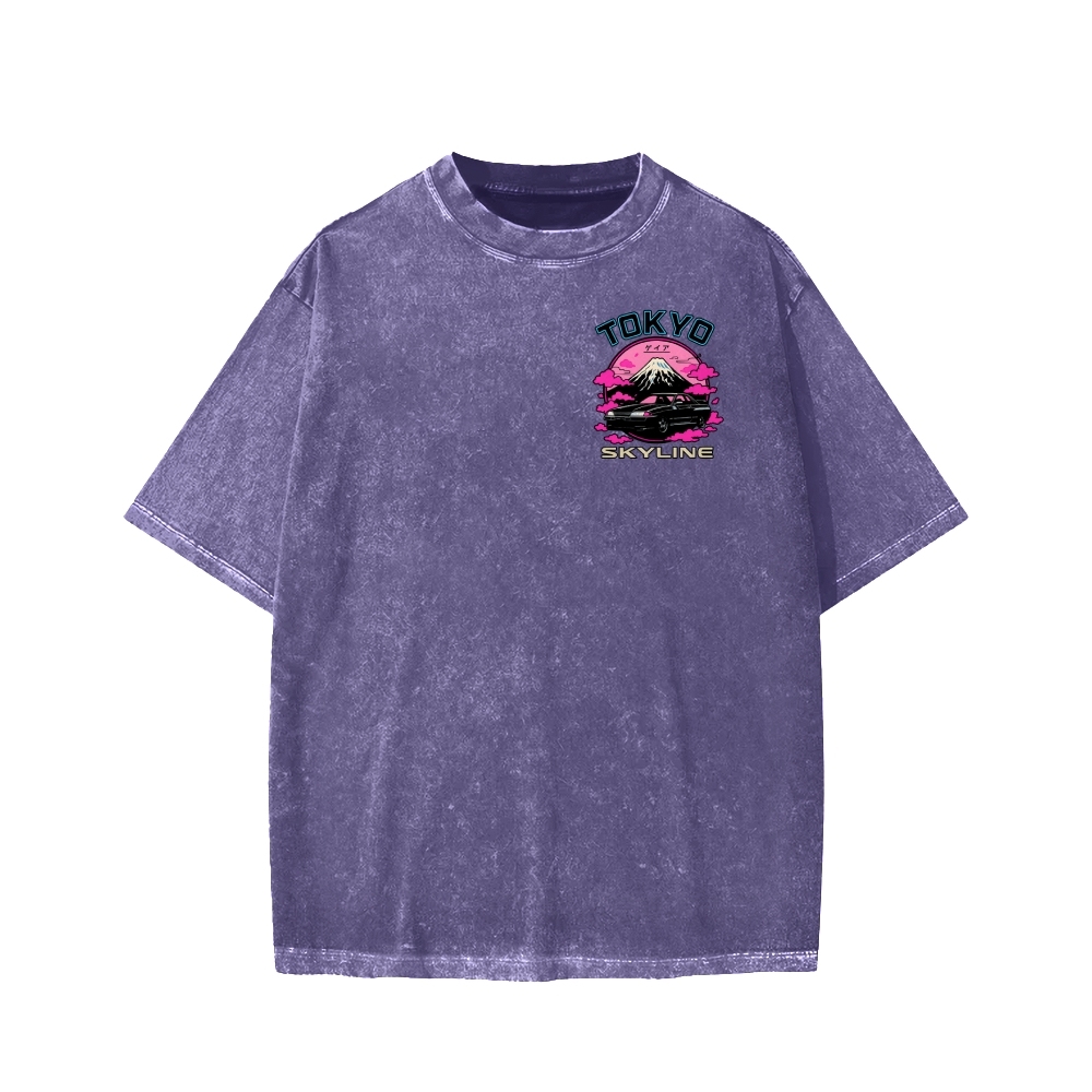 Tokyo-Assassin Tokyo Skyline R32 GT-R Neon Vaporwave Mount Fuji Front And Back Printing Washed T-shirt