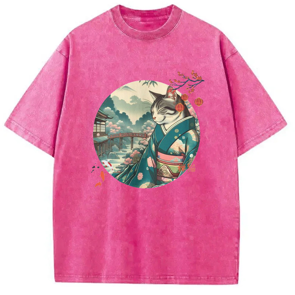 Tokyo-Assassin Fish And Kimono Cat Japanese Washed T-Shirt